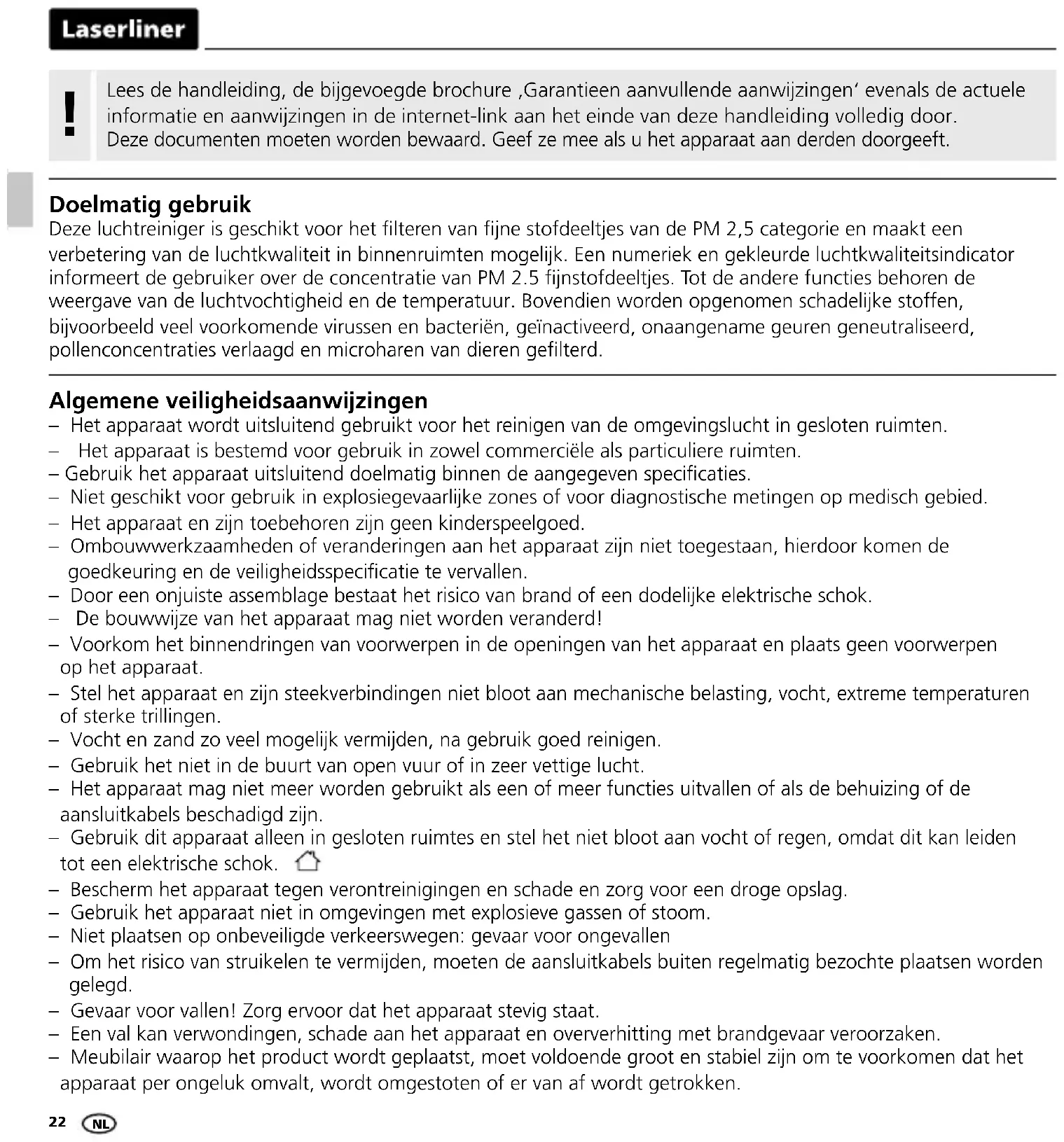 25μg/m³ Ambient temperature Measuring range Accuracy Disposal 0…50°C ±0.5 °C 1°C Humidity Measuring range (relative) Accuracy (absolute) Disposal 20…95%rH ±3%rH 5%rH Sensor type Fine particular matter, temperature, humidity Power supply Mains voltage 230V / 50 Hz Operating conditions 0°C … 60°C, max. humidity, 75%rH,nocondensation Storage conditions -10°C … 60°C, max. humidity, 85%rH,nocondensation Cable length 1,5 m Dimensions (W x H x D) 410 x 630 x 210 mm Weight 7000 g EU and UK directives and disposal This device complies with all necessary standards for the free movement of goods within the EU - and the UK. This product, including accessories and packaging, is an electrical appliance that must be recycled in an environmentally appropriate manner in accordance with European and UK directives on waste electrical and electronic equipment, batteries and packaging, in order to recover valuable raw materials. Further safety and supplementary notices at: https://laserliner.com EN22 Doelmatig gebruik DezeluchtreinigerisgeschiktvoorhetlterenvanjnestofdeeltjesvandePM2,5categorieenmaakteen verbetering van de luchtkwaliteit in binnenruimten mogelijk. Een numeriek en gekleurde luchtkwaliteitsindicator informeertdegebruikeroverdeconcentratievanPM2.5jnstofdeeltjes.Totdeanderefunctiesbehorende weergave van de luchtvochtigheid en de temperatuur. Bovendien worden opgenomen schadelijke stoffen, bijvoorbeeld veel voorkomende virussen en bacteriën, geïnactiveerd, onaangename geuren geneutraliseerd, pollenconcentratiesverlaagdenmicroharenvandierengelterd. Algemene veiligheidsaanwzingen – Het apparaat wordt uitsluitend gebruikt voor het reinigen van de omgevingslucht in gesloten ruimten. – Hetapparaatisbestemdvoorgebruikinzowelcommerciëlealsparticuliereruimten. –Gebruikhetapparaatuitsluitenddoelmatigbinnendeaangegevenspecicaties. – Niet geschikt voor gebruik in explosiegevaarlijke zones of voor diagnostische metingen op medisch gebied. – Het apparaat en zijn toebehoren zijn geen kinderspeelgoed. – Ombouwwerkzaamheden of veranderingen aan het apparaat zijn niet toegestaan, hierdoor komen de goedkeuringendeveiligheidsspecicatietevervallen. – Door een onjuiste assemblage bestaat het risico van brand of een dodelijke elektrische schok. – De bouwwijze van het apparaat mag niet worden veranderd! – Voorkom het binnendringen van voorwerpen in de openingen van het apparaat en plaats geen voorwerpen op het apparaat. – Stel het apparaat en zijn steekverbindingen niet bloot aan mechanische belasting, vocht, extreme temperaturen of sterke trillingen. – Vocht en zand zo veel mogelijk vermijden, na gebruik goed reinigen. – Gebruik het niet in de buurt van open vuur of in zeer vettige lucht. – Het apparaat mag niet meer worden gebruikt als een of meer functies uitvallen of als de behuizing of de aansluitkabels beschadigd zijn. – Gebruik dit apparaat alleen in gesloten ruimtes en stel het niet bloot aan vocht of regen, omdat dit kan leiden tot een elektrische schok. – Bescherm het apparaat tegen verontreinigingen en schade en zorg voor een droge opslag. – Gebruik het apparaat niet in omgevingen met explosieve gassen of stoom. – Niet plaatsen op onbeveiligde verkeerswegen: gevaar voor ongevallen – Om het risico van struikelen te vermijden, moeten de aansluitkabels buiten regelmatig bezochte plaatsen worden gelegd. – Gevaar voor vallen! Zorg ervoor dat het apparaat stevig staat. – Een val kan verwondingen, schade aan het apparaat en oververhitting met brandgevaar veroorzaken. – Meubilair waarop het product wordt geplaatst, moet voldoende groot en stabiel zijn om te voorkomen dat het apparaat per ongeluk omvalt, wordt omgestoten of er van af wordt getrokken. Lees de handleiding, de bijgevoegde brochure ‚Garantieen aanvullende aanwijzingen‘ evenals de actuele informatie en aanwijzingen in de internet-link aan het einde van deze handleiding volledig door. Deze documenten moeten worden bewaard. Geef ze mee als u het apparaat aan derden doorgeeft.