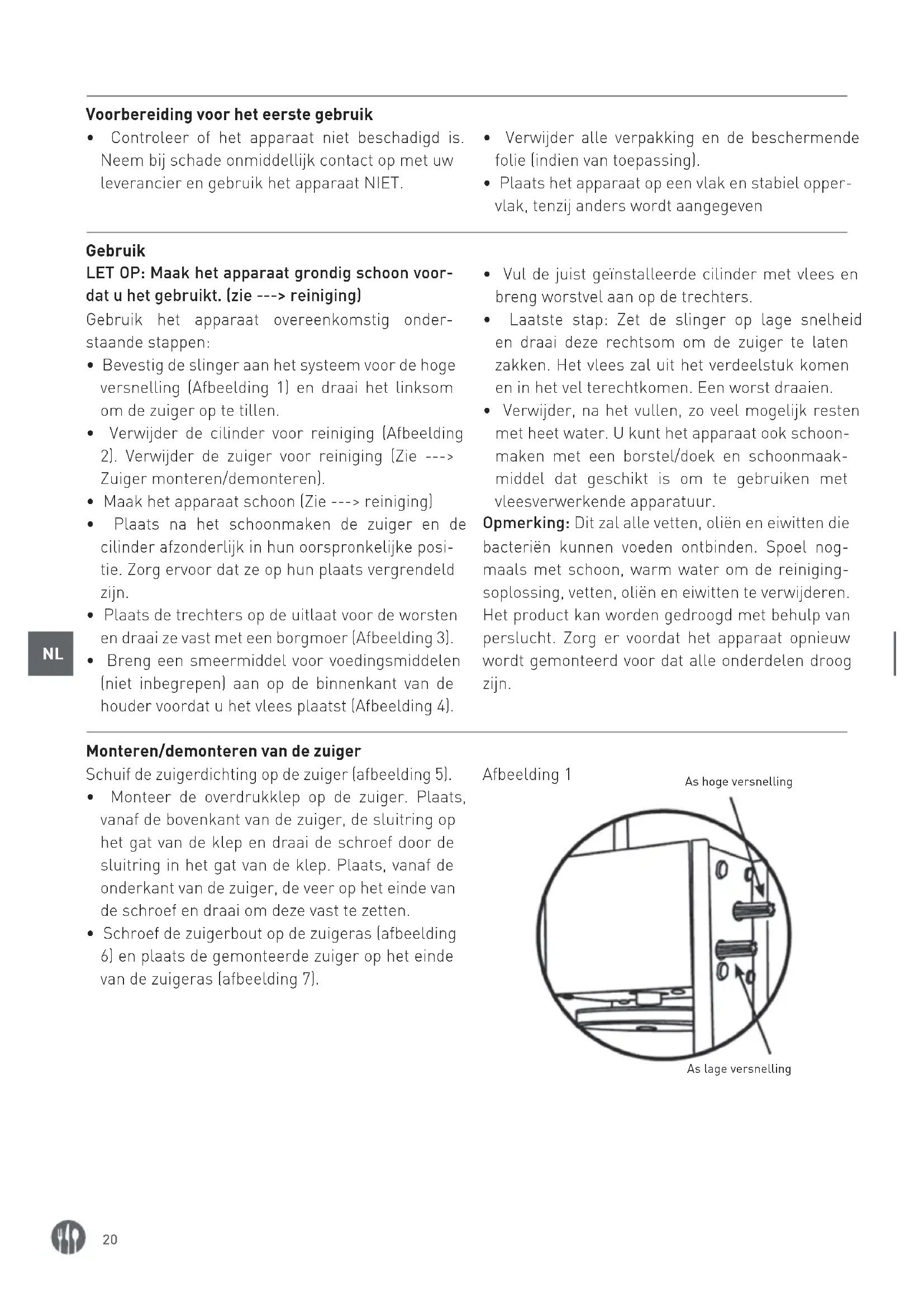- Maak alle delen die rechtstreeks met voedsel in contact komen schoon, bijv. cilinder, trech- ters, zuiger, enz. Gebruik een borstel/doek en een geschikt reinigingsmiddel, dat gebruikt mag worden bij vleesverwerkende apparatuur.
