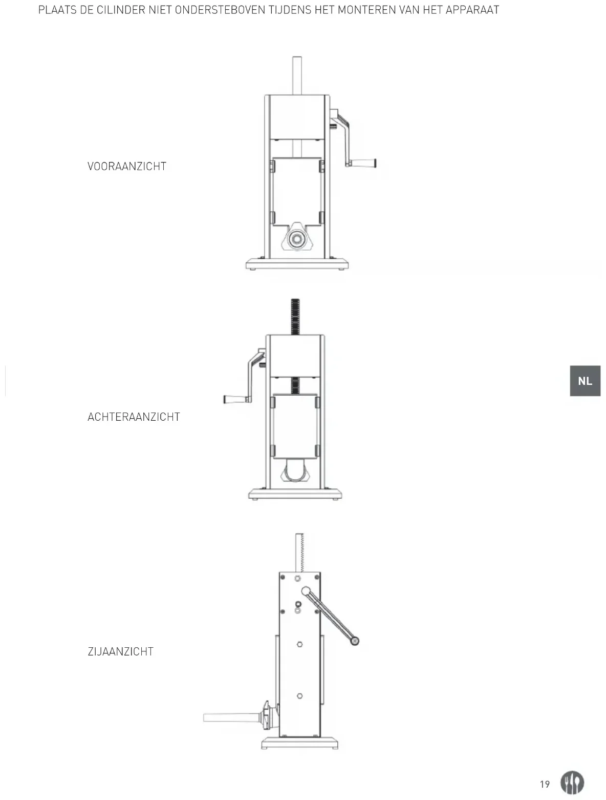 - Het gehakte vlees uit de spuitmond komt en in het worstvel gaat nadat er hard op de zuiger wordt gedrukt. Als dit niet het geval is, druk dan NIET nog harder op de zuiger. Controleer of de uitlaat of de spuitmond is verstopt door vlees. Als dit het geval is, verwijder het vlees dan. Als er verstopping optreedt, controleer dan of het vlees voldoende wordt gehakt voor de geselect- eerde spuitmond. OPSLAG: DIT APPARAAT MOET WORDEN OPGESLAGEN OP EEN SCHONE EN DROGE PLAATS. STEL HET APPARAAT NIET BLOOT AAN REGEN OF VOCHT. Technische gegevens Itemnr 282571 282588 282090 282151 282137 282144 Kleur Roestvrij staal Rood Netto gewicht ca. 10,5 kg 12 kg 13,5 kg 20 kg 10,5 kg 12 kg Capaciteit 3L 5L 7L 10L 3L 5L Afmetingen cilinder Ø140x(H)200