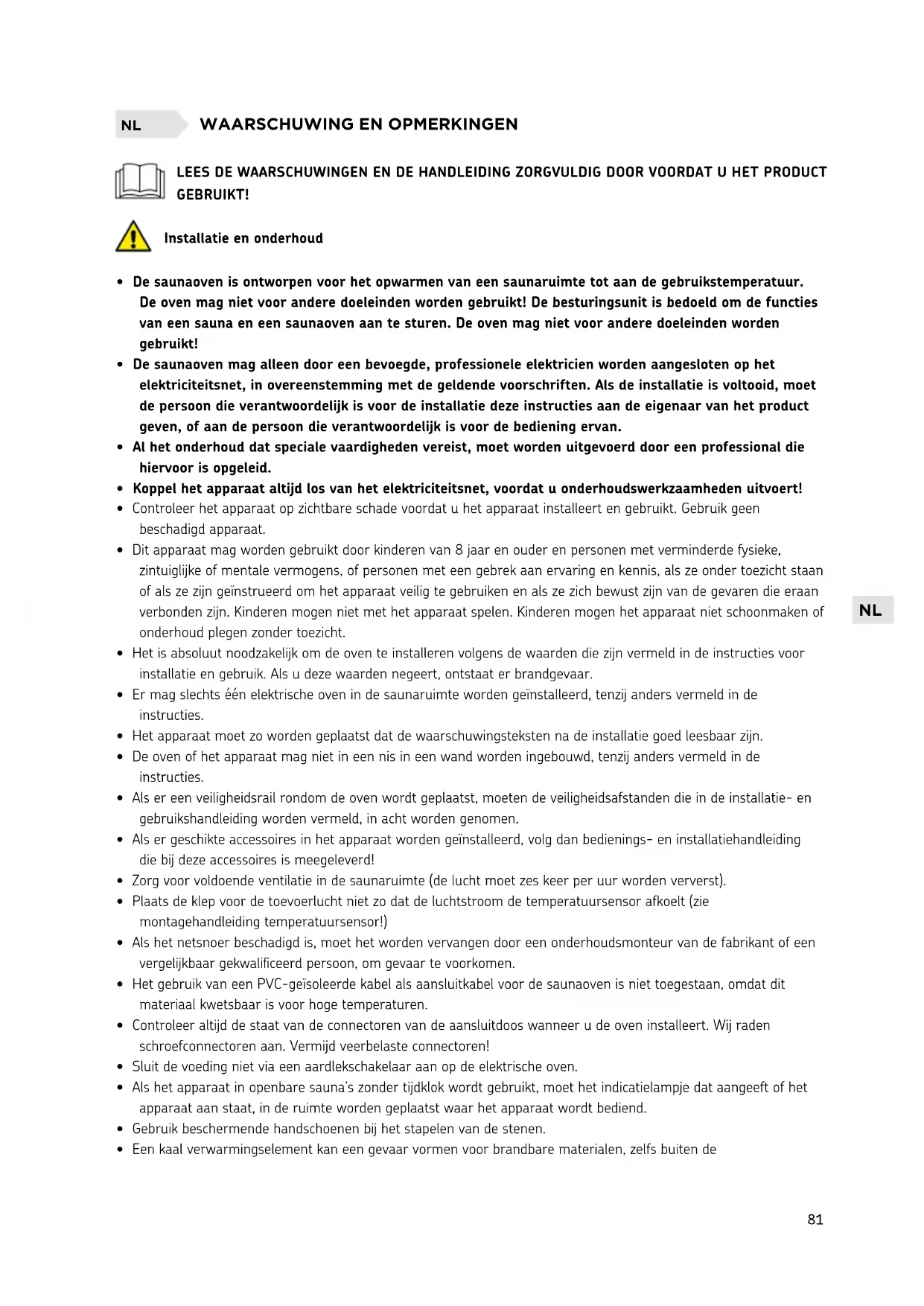 INHOUD Deze instructies voor gebruik en installatie zijn bedoeld voor de eigenaar of de persoon die verantwoordelijk is voor de sauna, alsook voor de elektrische installateur die de elektrische aansluiting moet uitvoeren. Nadat de installatie voltooid werd moet de persoon die verantwoordelijk is voor de installatie deze instructies doorgeven aan de eigenaar van de sauna of aan de persoon die verantwoordelijk is voor het gebruik van de sauna. Lees aub deze instructies zorgvuldig door vooraleer u de oven gaat gebruiken.