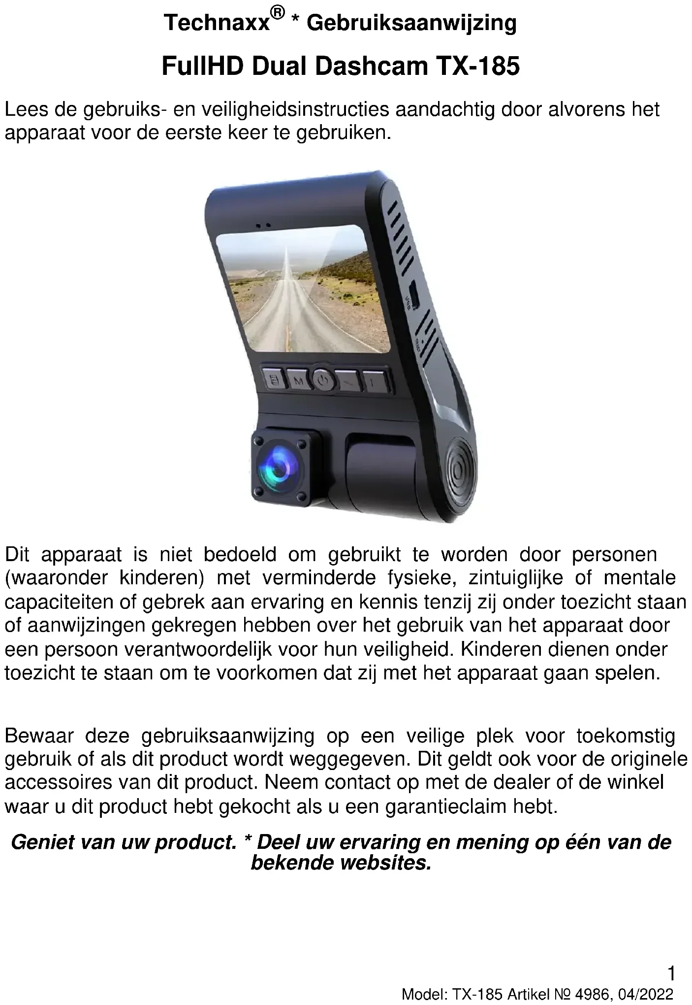 Tips ⚫Stel voor gebruik de juiste tijd in via het systeemmenu.⚫ Leg het netsnoer op een dergelijke manier zodat niemand er per ongeluk over kan struikelen. ⚫ Draag het apparaat nooit via het netsnoer. ⚫ Klem of beschadig het netsnoer niet. ⚫ Zorg ervoor dat het stopcontact komen niet in contact komt met water, stoom of andere vloeistoffen. ⚫ Controleer het volledig product regelmatig op een juiste werking, stevigheid en schade om defecten te vermijden. ⚫ Gebruik het product alleen voor doeleinden volgens de beoogde functie ⚫ Beschadig het product niet. Volgende situaties kunnen het product beschadigen: Verkeerde spanning, ongevallen (waaronder vloeistof of vocht), verkeerd gebruik of misbruik van het product, verkeerde installatie, problemen met de voeding (waaronder schade door stroompieken of bliksem), aantasting door insecten, aanpassen van het product door niet-bevoegde personen, blootstelling aan abnormaal corrosieve materialen, aanbrengen van vreemde voorwerpen in het apparaat, gebruik met niet vooraf goedgekeurde accessoires. ⚫3 Model: TX-185 Artikel Nr. 4986, 04/2022 Raadpleeg en neem alle waarschuwingen en voorzorgsmaatregelen in de Gebruiksaanwijzing in acht. Veiligheidsinstructies ⚫ Raak het apparaat nooit aan met natte of vochtige handen. ⚫ Het apparaat kan alleen worden gebruikt met de op het binnenpaneel en de voeding vermelde spanning. ⚫ Plaats dit apparaat niet in de buurt van vochtigheid of water. ⚫ Plaats het apparaat nooit op een onstabiel oppervlak. Hij kan beschadigd raken, of mensen kunnen gewond raken. Gebruik alleen accessoires die van de fabrikant afkomstig zijn, en gebruik ze volgens diens instructies. ⚫ De kabel is omhuld en geïsoleerd. Plaats geen voorwerpen op de kabel, omdat hiermee de beschermende functie verloren kan gaan. Voorkom dat er teveel spanning op de kabel komt te staan, vooral op de stekkers. ⚫ Trek altijd aan de stekker en niet aan de kabel als u de stekker uit het stopcontact wilt halen. De kabel kan anders breken. ⚫ Sluit niet teveel apparaten aan op stopcontacten, verlengsnoeren e.d., dat kan brand of elektrische schokken veroorzaken. ⚫ Steek geen voorwerpen in de openingen in het apparaat, omdat sommige plaatsen onder stroom staan en contact hiermee brand of elektrische schokken kan veroorzaken. ⚫ Trek voor het schoonmaken de stekker uit de sigarettenaansteker. ⚫ Gebruik geen schoonmaakvloeistoffen of schoonmaaksprays. Het apparaat mag alleen worden gereinigd met een vochtige doek. ⚫ Sluit geen externe apparaten aan die niet zijn goedgekeurd door de fabrikant. ⚫ De openingen in de behuizing zijn bedoeld ter ventilatie zodat het apparaat niet oververhit raakt. Deze mogen nooit afgedekt worden. ⚫ Gebruik de camera niet in direct zonlicht of plaatsen waar de temperatuur een lange tijd boven de 70°C uitkomt. Waarschuwingen ⚫ Probeer de apparaat nooit uit elkaar te halen, dit kan leiden tot kortsluiting of schade. ⚫ De levensduur van de accu neemt af met het gebruik. Laad de accu tenminste eenmaal per maand op als deze lang niet gebruikt wordt, om de accu te sparen. ⚫ Waarschuwingen over batterijen: Onjuist gebruik van de batterij kan brand of chemische brandwonden veroorzaken. De batterij kan exploderen als deze beschadigd is. ⚫ Niet aanpassen, repareren of verwijderen zonder professioneel advies. ⚫ Gebruik geen bijtende of vluchtige vloeistoffen om te reinigen. ⚫ Laat de apparaat niet vallen en schud er ook niet mee, de inwendige elektronica of mechanische onderdelen kunnen hierdoor kapot gaan. ⚫ Bewaar de4 Model: TX-185 Artikel Nr. 4986, 04/2022 apparaat in een droge en goed geventileerde ruimte. Vermijd hoge vochtigheid of hoge temperatuur. ⚫ Deze apparaat is niet waterdicht; houd het uit de buurt van vocht. ⚫ Houd het apparaat uit de buurt van kleine kinderen. Disclaimer ⚫ Technaxx Deutschland is in geen geval aansprakelijk voor directe, indirecte, incidentele of speciale gevolgschade aan eigendommen of leven, onjuiste opslag en dergelijke die voortvloeien uit het gebruik of misbruik van hun producten. ⚫ Dit apparaat is NIET bedoeld voor gebruik voor illegale surveillance en zal in geen enkele vorm worden gebruikt als bewijsmateriaal in claimzaken. ⚫ In sommige landen is het verboden om iets op de voorruit te monteren, of is het alleen toegestaan dashcams op bepaalde plaatsen op de voorruit te monteren. Het is de verantwoordelijkheid van de eigenaar om de dashcam te monteren volgens de lokale regelgeving. ⚫ Er kunnen foutmeldingen optreden, afhankelijk van de omgeving waarin het apparaat gebruikt wordt. ⚫ Technaxx Deutschland is niet aansprakelijk/verantwoordelijk voor niet-opgenomen gebeurtenissen, ontbrekende bestanden, etc... Kenmerken