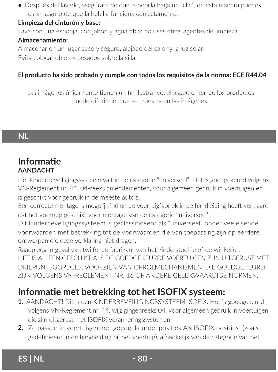 Zorg er na het wassen voor dat de gesp het kenmerkende “klik”-geluid produceert, zodat u er zeker van kunt zijn dat de gesp goed werkt.‑ 90 ‑ Reinigen van de gordel en de basis: Bewaren op een veilige, droge plaats, uit de buurt van warmte en zonlicht. Vermijd het plaatsen van zware voorwerpen op het stoeltje. Opslag: Bewaren op een veilige, droge plaats, uit de buurt van warmte en zonlicht. Vermijd het plaatsen van zware voorwerpen op het stoeltje. Het product is getest en voldoet aan alle eisen van de normen: ECE R44.04 De foto’s dienen alleen ter illustrae, het werkelijke uiterlijk van de producten kan afwijken van de foto’s.