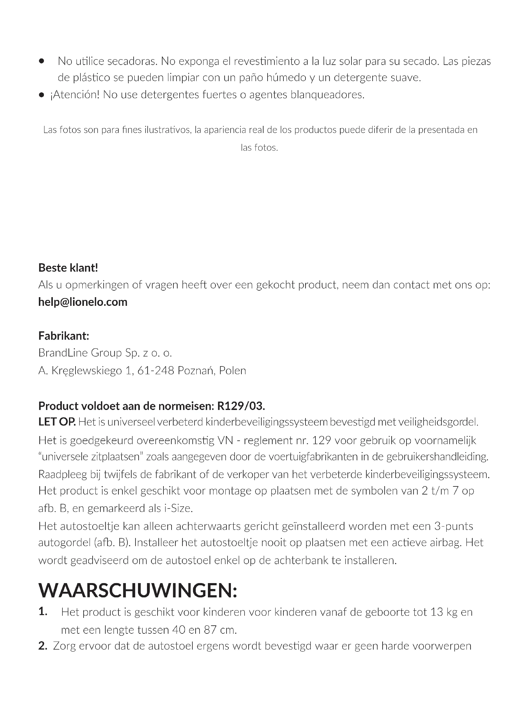 Beste klant! Als u opmerkingen of vragen hee over een gekocht product, neem dan contact met ons op: help@lionelo.com Fabrikant: BrandLine Group Sp. z o. o. A. Kręglewskiego 1, 61-248 Poznań, Polen Product voldoet aan de normeisen: R129/03. LET OP. Het is universeel verbeterd kinderbeveiligingssysteem bevesgd met veiligheidsgordel. Het is goedgekeurd overeenkomsg VN - reglement nr. 129 voor gebruik op voornamelijk “universele zitplaatsen” zoals aangegeven door de voertuigfabrikanten in de gebruikershandleiding. Raadpleeg bij twijfels de fabrikant of de verkoper van het verbeterde kinderbeveiligingssysteem. Het product is enkel geschikt voor montage op plaatsen met de symbolen van 2 t/m 7 op a. B, en gemarkeerd als i-Size. Het autostoeltje kan alleen achterwaarts gericht geïnstalleerd worden met een 3-punts autogordel (a. B). Installeer het autostoeltje nooit op plaatsen met een aceve airbag. Het wordt geadviseerd om de autostoel enkel op de achterbank te installeren. WAARSCHUWINGEN: