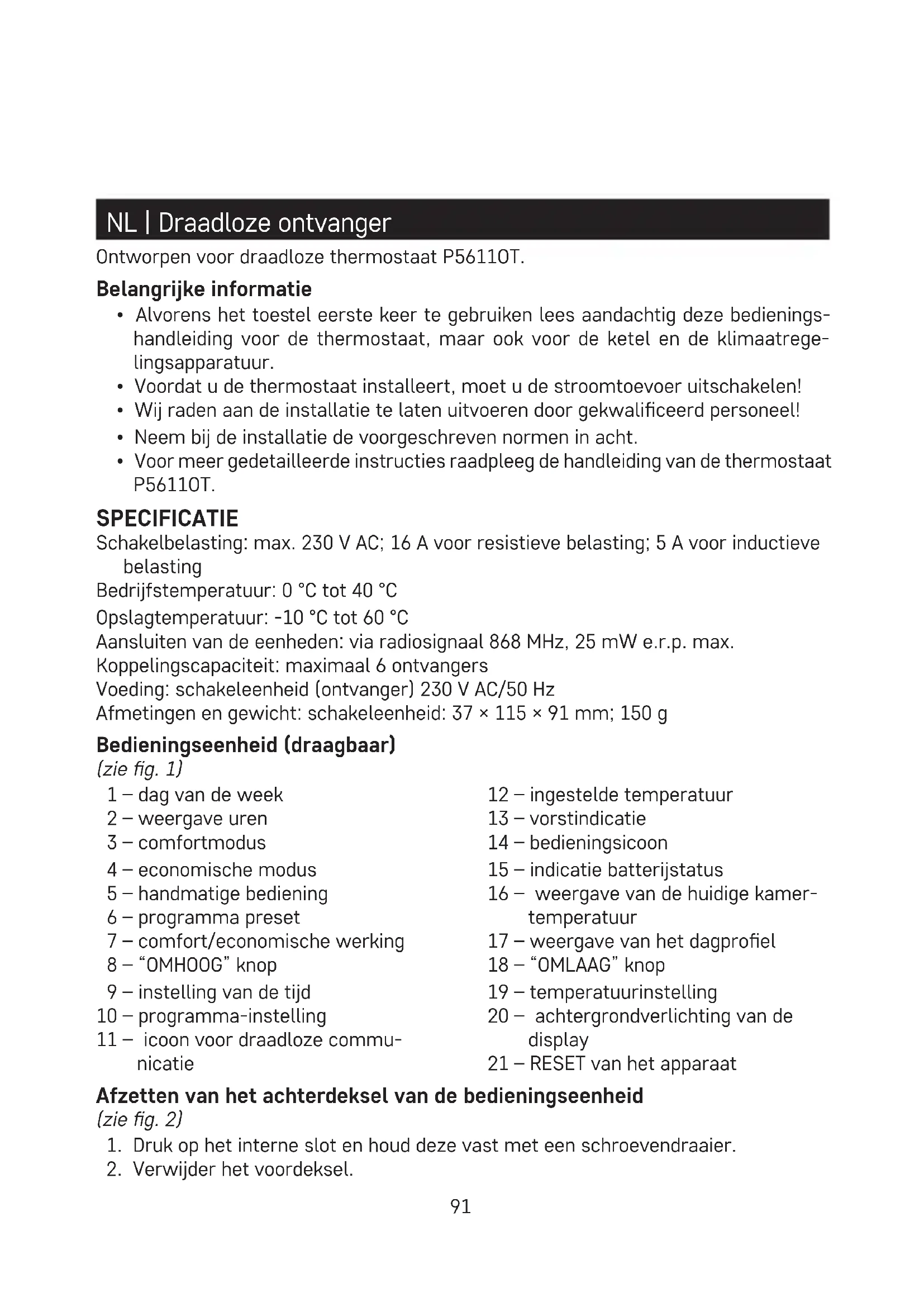 - Voor meer gedetailleerde instructies raadpleeg de handleiding van de thermostaat P5611OT. SPECIFICATIE Schakelbelasting: max. 230 V AC; 16 A voor resistieve belasting; 5 A voor inductieve belasting Bedrijfstemperatuur: 0 °C tot 40 °C Opslagtemperatuur: -10 °C tot 60 °C Aansluiten van de eenheden: via radiosignaal 868 MHz, 25 mW e.r.p. max. Koppelingscapaciteit: maximaal 6 ontvangers Voeding: schakeleenheid (ontvanger) 230 V AC/50 Hz Afmetingen en gewicht: schakeleenheid: 37 × 115 × 91 mm; 150 g Bedieningseenheid (draagbaar) (zie g. 1) 1 – dag van de week 2 – weergave uren 3 – comfortmodus 4 – economische modus 5 – handmatige bediening 6 – programma preset 7 – comfort/economische werking 8 – “OMHOOG” knop 9 – instelling van de tijd 10 – programma-instelling 11 – icoon voor draadloze commu- nicatie 12 – ingestelde temperatuur 13 – vorstindicatie 14 – bedieningsicoon 15 – indicatie batterijstatus 16 – weergave van de huidige kamer- temperatuur 17 – weergave van het dagproel 18 – “OMLAAG” knop 19 – temperatuurinstelling 20 – achtergrondverlichting van de display 21 – RESET van het apparaat Afzetten van het achterdeksel van de bedieningseenheid (zie g. 2)