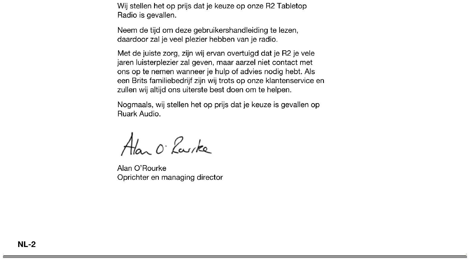 Gebruikershandleiding NLNL-2 Wij stellen het op prijs dat je keuze op onze R2 Tabletop Radio is gevallen. Neem de tijd om deze gebruikershandleiding te lezen, daardoor zal je veel plezier hebben van je radio. Met de juiste zorg, zijn wij ervan overtuigd dat je R2 je vele jaren luisterplezier zal geven, maar aarzel niet contact met ons op te nemen wanneer je hulp of advies nodig hebt. Als een Brits familiebedrijf zijn wij trots op onze klantenservice en zullen wij altijd ons uiterste best doen om te helpen. Nogmaals, wij stellen het op prijs dat je keuze is gevallen op Ruark Audio. Alan O’Rourke Oprichter en managing directorNL-3