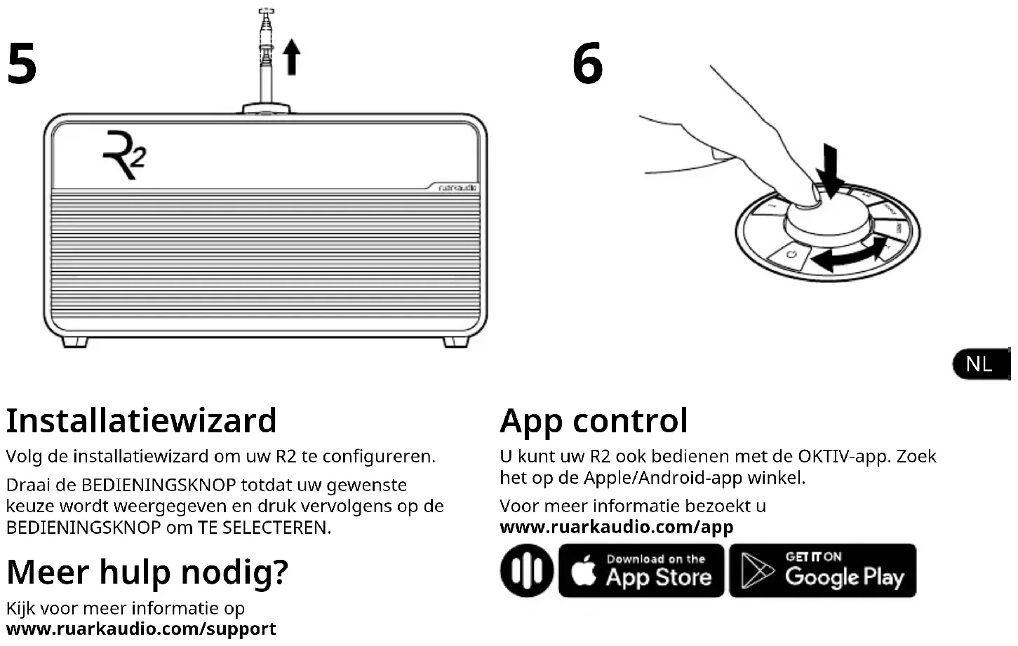 Installatiewizard Volg de installatiewizard om uw R2 te congureren. Draai de BEDIENINGSKNOP totdat uw gewenste keuze wordt weergegeven en druk vervolgens op de BEDIENINGSKNOP om TE SELECTEREN. Meer hulp nodig? Kijk voor meer informatie op www.ruarkaudio.com/support App control U kunt uw R2 ook bedienen met de OKTIV-app. Zoek het op de Apple/Android-app winkel. Voor meer informatie bezoekt u www.ruarkaudio.com/appKnoppen