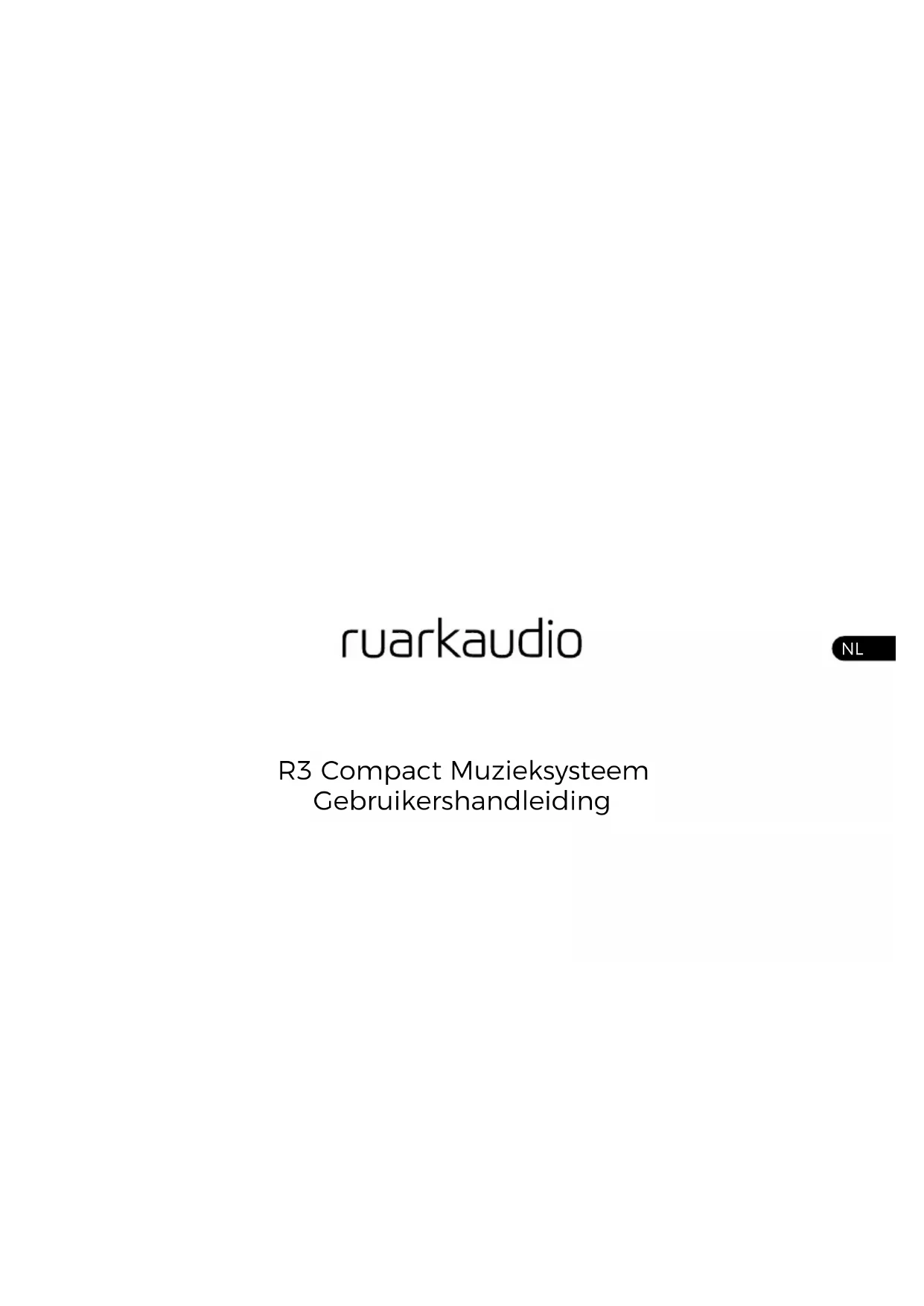 GebruikershandleidingVeiligheids- en regelgevende informatie ● Lees deze gebruikershandleiding en volg alle instructies, het zal u helpen bij het correct opstellen en bedienen van uw product. ● Let op alle waarschuwingen en bewaar deze gebruikershandleiding voor toekomstig gebruik. ● Probeer geen beschadigd apparaat te gebruiken daar dit zou kunnen resulteren in een gevaarlijke elektrische schok. ● De eenheid niet openen of ongeacht welke panelen verwijderen om de elektronica bloot te leggen. Geen interne onderdelen die door de gebruiker gerepareerd of onderhouden kunnen worden. ● Laat al het onderhoud over aan gekwaliceerd servicepersoneel. Onderhoud is nodig wanneer het apparaat op enige wijze is beschadigd, zoals het stroomvoorzieningssnoer of de stekker is beschadigd, er vloeistof is gemorst of voorwerpen in het apparaat zijn gevallen, het apparaat is blootgesteld aan regen of vocht, niet normaal werkt, of is gevallen. ● Dit apparaat is ALLEEN bedoeld voor bediening vanaf de AC- spanningen die op het paneel aan de achterkant worden vermeld of bijbehorende stroomvoorziening. Bediening vanuit andere spanningen dan de aangegeven kunnen onherstelbare schade aan het apparaat veroorzaken waardoor de productgarantie kan komen te vervallen. ● Controleer of de netstroomstekker of netstroomaansluiting in de eenheid gemakkelijk toegankelijk is in het geval dat loskoppeling van de netstroom nodig is. ● De netstroomadapter, netstroomstekker of netstroomaansluiting moet uit de contactdoos worden verwijderd om het systeem volledig los te koppelen van de netstroom. ● Plaats geen open vuurbronnen, zoals brandende kaarsen, op of bij het apparaat. Niet installeren in de buurt van warmtebronnen zoals radiatoren, kachels of andere apparaten, (inclusief versterkers) die warmte afgeven. ● Vermijd blootstelling aan extreme hitte of kou. ● Gebruik alleen voor dit apparaat gespeciceerde hulpstukken/ accessoires. Voer geen aanpassingen aan het systeem of de accessoires uit. Onbevoegde veranderingen kunnen de veiligheid, naleving van regels en prestatie van het systeem aantasten. ● Gebruik alleen de geleverde antenne of een goedgekeurde vervangende antenne. ● Om het risico op brand of elektrische schok te verminderen, het apparaat niet blootstellen aan regen of vocht. Dit apparaat niet blootstellen aan druppels of spetters en plaats geen met vloeistof gevulde voorwerpen, zoals vazen, op of bij het apparaat. Zoals met alle elektronische producten, pas op dat er in geen enkel deel van het systeem vloeistoffen worden gemorst. Vloeistoffen kunnen een defect en/of een brandgevaar veroorzaken. ● Neem de stekker van dit apparaat uit de contactdoos tijdens onweer of wanneer het gedurende lange tijd niet wordt gebruikt om schade aan dit apparaat te voorkomen. ● Om risico op brand of elektrische schok te voorkomen, vermijd overbelasting van wandcontactdozen, verlengsnoeren of integrale gemakscontactdozen. ● Langdurige blootstelling aan luide muziek kan gehoorbeschadiging veroorzaken. Het is het beste een extreem volume te vermijden bij gebruik van koptelefoons, met name gedurende langere perioden. ● Installeer dit apparaat niet in een besloten ruimte. Laat altijd een ruimte van ten minste 10 cm rond het apparaat open voor ventilatie en let op dat gordijnen of andere voorwerpen nooit ventilatie-openingen op het apparaat bedekken. Dit apparaat is gelabeld conform Europese Richtlijn 2012/19/ EU met betrekking tot elektrisch en elektronisch afval. Dit symbool geeft aan dat het product of bijbehorende batterijen niet als gewoon huishoudelijk afval mogen worden weggegooid. Zoals met alle elektrische apparatuur, weggooien volgens lokale voorschriften.NL CE-COMPLIANTIE-INFORMATIE Dit product voldoet aan alle vereisten uit de EU Richtlijn zoals wettelijk van toepassing. Ruark Audio verklaart hierbij dat dit apparaat voldoet aan de essentiële vereisten en andere relevante voorschriften van de Europese Richtlijn voor Radio-apparatuur 2014/53/EU. U kunt de volledige CE- Conformiteitsverklaring downloaden op www.ruarkaudio.com/doc/R3doc.pdf Specificaties Versterkers en drivers 2 x 75mm Ruark NS+ drivers 30W Klasse AB versterker Versterkte digitale 3D audioprocessor Tuner DAB, DAB+ en FM Tuner met RDS 75 Ohm F-type DAB/FM-antenne-invoer CD-speler CD, CD-ROM, CD-R/RW disks MP3, WMA, AAC 320kbps Digitaal audio Audioele 32-bits 112dB audiostereo DAC Internetradio, Spotify Connect, Amazon Music, Deezer, TIDAL, UPnP™ DLNA Wi-Fi 802.11b/g/n ondersteunt WEP, WPA & WPA2 veiligheid MP3 48kHz 320kbps, AAC 96kHz 320kbps, FLAC 24-bit 48kHz, WAV 16-bit 48kHz / 24 bit 44.1kHz, WMA 44.1kHz 320kbps Bluetooth: SBC, AAC, A2DP, aptX Ingangen en uitgangen Digitaal optisch (TOSLINK) 24-bit 192kHz Lijningang (RCA) 2.3Vrms Lijn uit (RCA) 2.0Vrms Ethernet (RJ45) USB 2.0, 5W (5V 1A) 3,5mm jack koptelefoonuitgang, 25mW 16-32 Ohm Vermogen Invoervermogen 100V-240V AC, 50-60 Hz 1A max Uitvoervermogen 14V DC 2.85A Nominaal verbruik: 5W Stand-by verbruik: 1.6W Batterijen voor afstandsbediening: 2 x 1.5V AAA Dimensies H167 x B420 x D220mm - 5.3kg Specicatie en ontwerp kunnen zonder mededeling worden aangepast. Ruark Audio aanvaardt geen verantwoordelijkheid voor mogelijke fouten in deze handleiding en de daarin opgenomen informatie kan zonder berichtgeving veranderen. Problemen oplossen Voor hulp met uw product, zie de bladzijde met FAQ (Regelmatig gestelde vragen) in het ondersteunende gebied van onze website. Voor meer informatie bezoekt u www.ruarkaudio.com/supportWat zit er in de doos Controleer of alle op de onderstaande lijst vermelde onderdelen in de doos zitten. Wanneer er een onderdeel ontbreekt, dient u de R3 niet te gebruiken en rechtstreeks contact met ons op te nemen wanneer hij in het VK werd aangeschaft of met uw Ruark Audio dealer wanneer hij buiten het VK werd gekocht.