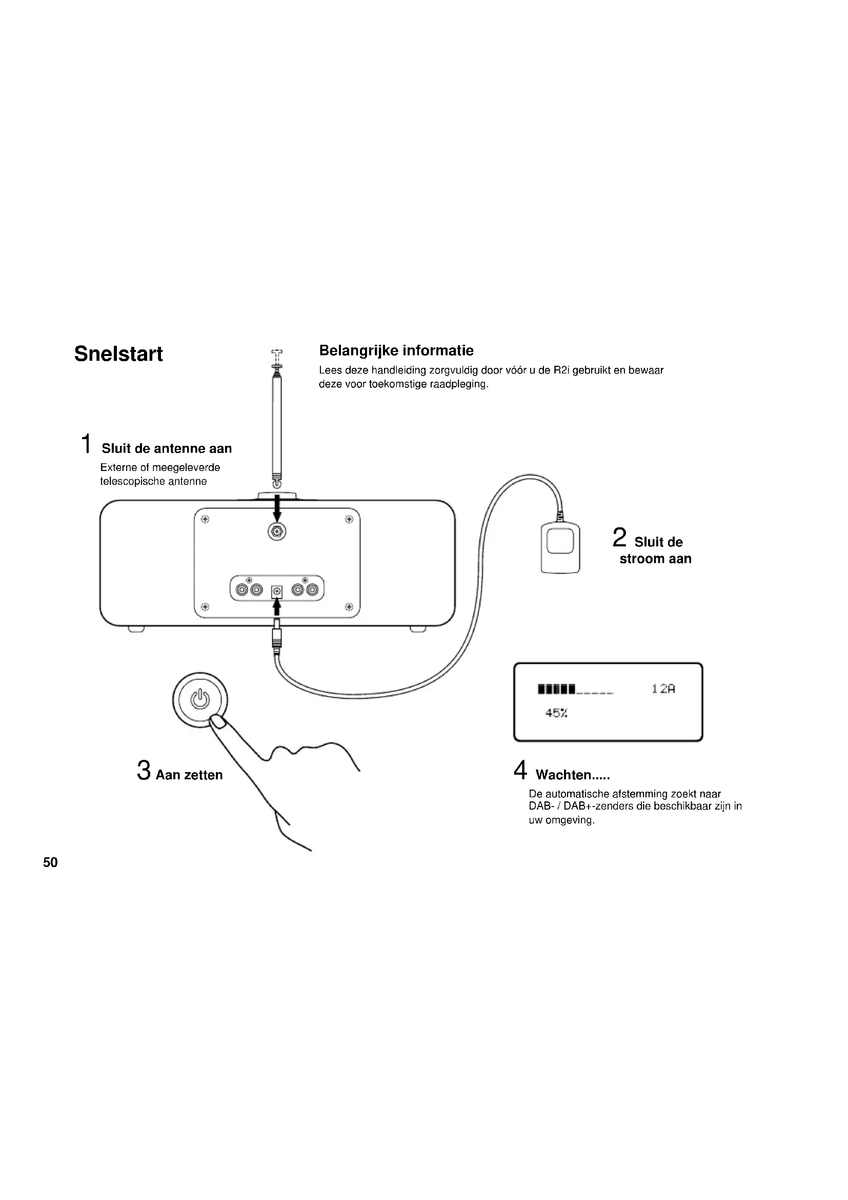 NL50 Snelstart Belangrijke informatie Lees deze handleiding zorgvuldig door vóór u de R2i gebruikt en bewaar deze voor toekomstige raadpleging. 1 Sluit de antenne aan Externe of meegeleverde telescopische antenne 2 Sluit de stroom aan 3 Aan zetten 4 Wachten..... De automatische afstemming zoekt naar DAB- / DAB+-zenders die beschikbaar zijn in uw omgeving.51 5 De afstandsbediening activeren Verwijder het plastic lipje om de batterij te activeren ..... naar de radio DAB: druk op ▲▼ om de lijst met beschikbare zenders te doorzoeken. Druk op OK om een zender te kiezen. FM: houd ▲▼ ingedrukt om te scannen naar de volgende beschikbare zender. ..... naar MP3 en andere audioapparaten Sluit de analoge audiostekker van een extern audioapparaat, zoals een MP3, laptop of draadbare CD- speler, aan op de aux-ingang aan de voor- of achterkant van de R2i. 6 Luister..... Selecteer eerst uw gekozen bron ..... naar uw iPod Verwijder het stofkapje en sluit de juiste adapter aan om een iPod aan te sluiten. De R2i wordt geleverd met verschillende adapters zodat ook eerdere iPod-modellen gebruikt kunnen worden. Latere iPod-modellen zijn meestal voorzien van een adapter die in de koppeling op de R2i p
