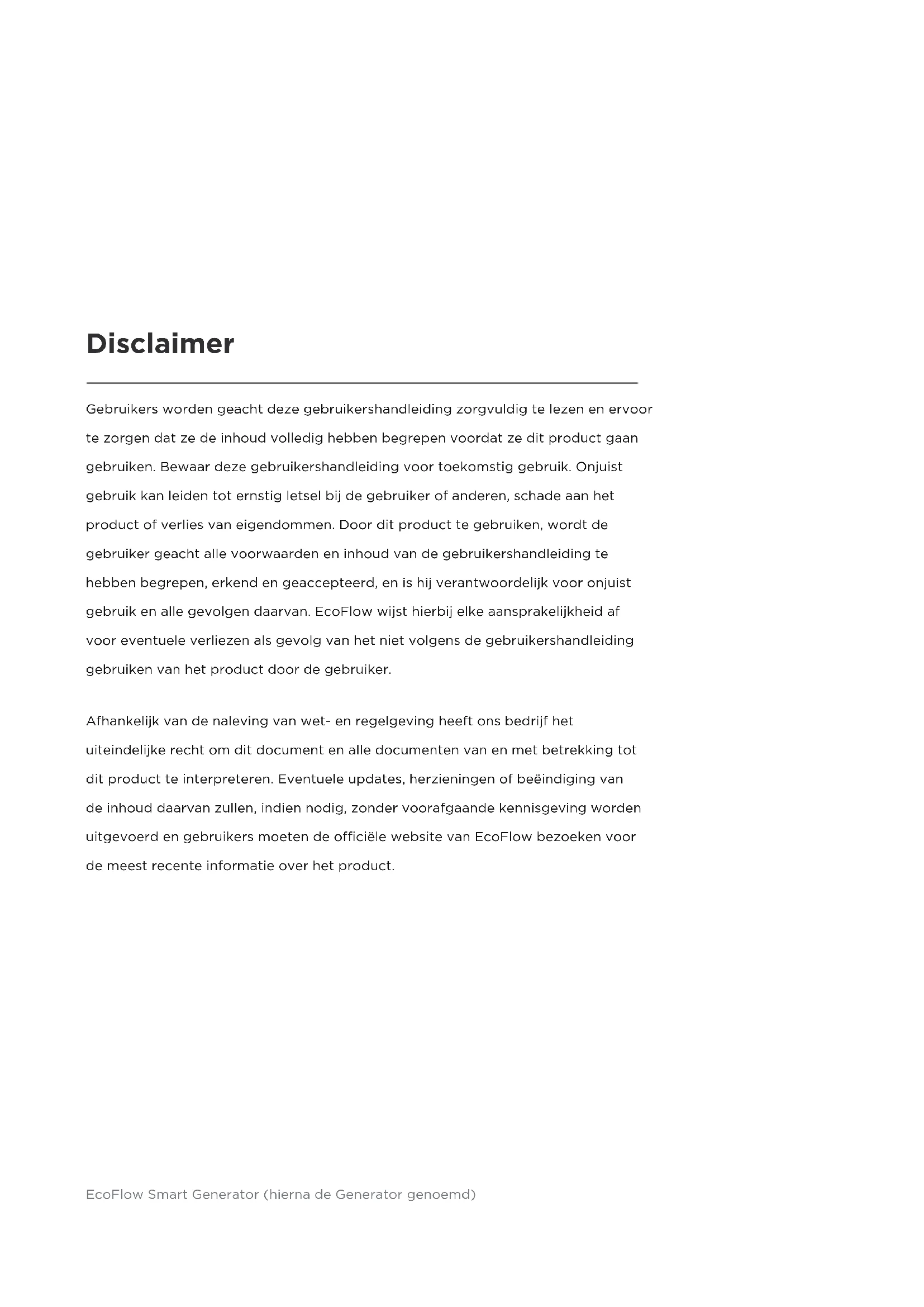 Gebruikers- handleidingGebruikers worden geacht deze gebruikershandleiding zorgvuldig te lezen en ervoor te zorgen dat ze de inhoud volledig hebben begrepen voordat ze dit product gaan gebruiken. Bewaar deze gebruikershandleiding voor toekomstig gebruik. Onjuist gebruik kan leiden tot ernstig letsel bij de gebruiker of anderen, schade aan het product of verlies van eigendommen. Door dit product te gebruiken, wordt de gebruiker geacht alle voorwaarden en inhoud van de gebruikershandleiding te hebben begrepen, erkend en geaccepteerd, en is hij verantwoordelijk voor onjuist gebruik en alle gevolgen daarvan. EcoFlow wijst hierbij elke aansprakelijkheid af voor eventuele verliezen als gevolg van het niet volgens de gebruikershandleiding gebruiken van het product door de gebruiker. Afhankelijk van de naleving van wet- en regelgeving heeft ons bedrijf het uiteindelijke recht om dit document en alle documenten van en met betrekking tot dit product te interpreteren. Eventuele updates, herzieningen of beëindiging van de inhoud daarvan zullen, indien nodig, zonder voorafgaande kennisgeving worden uitgevoerd en gebruikers moeten de officiële website van EcoFlow bezoeken voor de meest recente informatie over het product. Disclaimer EcoFlow Smart Generator (hierna de Generator genoemd)1