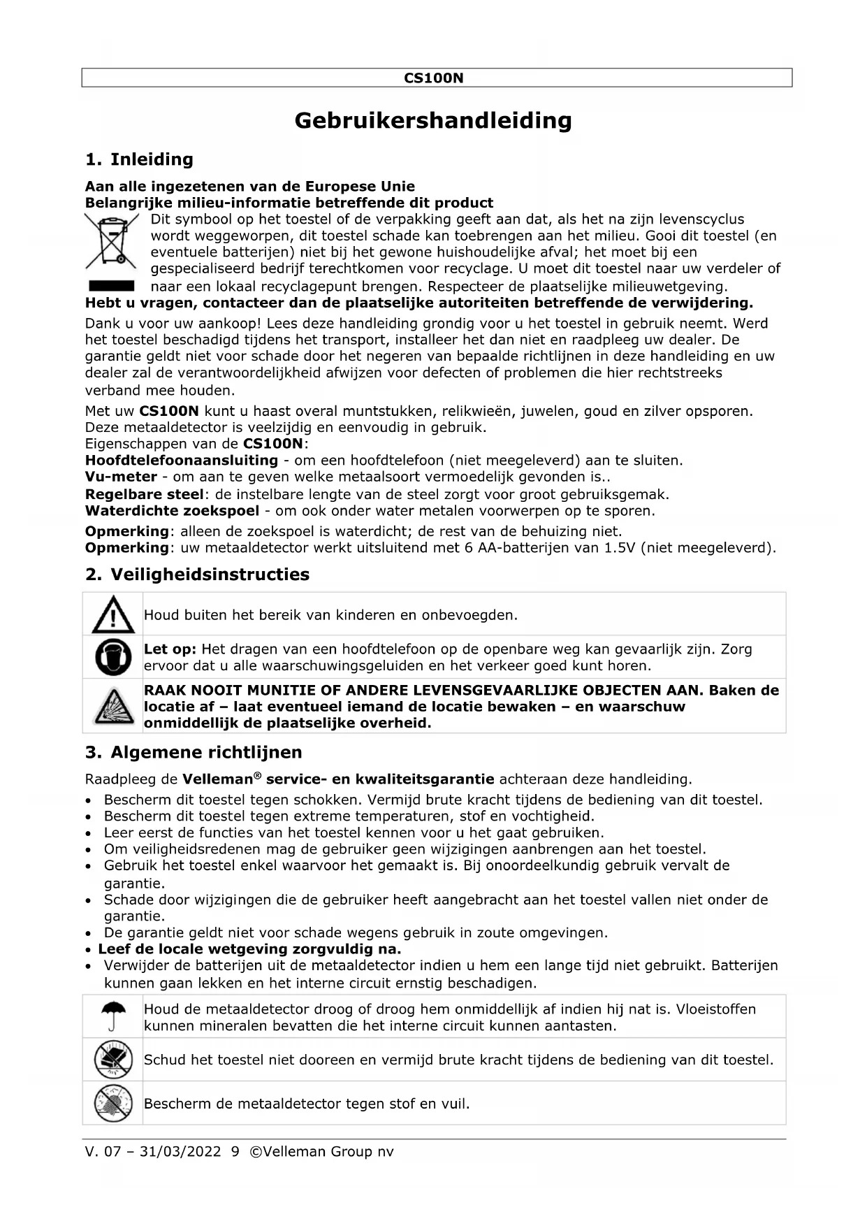 Aan alle ingezetenen van de Europese Unie Belangrijke milieu-informatie betreffende dit product Dit symbool op het toestel of de verpakking geeft aan dat, als het na zijn levenscyclus wordt weggeworpen, dit toestel schade kan toebrengen aan het milieu. Gooi dit toestel (en eventuele batterijen) niet bij het gewone huishoudelijke afval; het moet bij een gespecialiseerd bedrijf terechtkomen voor recyclage. U moet dit toestel naar uw verdeler of naar een lokaal recyclagepunt brengen. Respecteer de plaatselijke milieuwetgeving. Hebt u vragen, contacteer dan de plaatselijke autoriteiten betreffende de verwijdering. Dank u voor uw aankoop! Lees deze handleiding grondig voor u het toestel in gebruik neemt. Werd het toestel beschadigd tijdens het transport, installeer het dan niet en raadpleeg uw dealer. De garantie geldt niet voor schade door het negeren van bepaalde richtlijnen in deze handleiding en uw dealer zal de verantwoordelijkheid afwijzen voor defecten of problemen die hier rechtstreeks verband mee houden. Met uw CS100N kunt u haast overal muntstukken, relikwieën, juwelen, goud en zilver opsporen. Deze metaaldetector is veelzijdig en eenvoudig in gebruik. Eigenschappen van de CS100N: Hoofdtelefoonaansluiting - om een hoofdtelefoon (niet meegeleverd) aan te sluiten. Vu-meter - om aan te geven welke metaalsoort vermoedelijk gevonden is.. Regelbare steel: de instelbare lengte van de steel zorgt voor groot gebruiksgemak. Waterdichte zoekspoel - om ook onder water metalen voorwerpen op te sporen. Opmerking: alleen de zoekspoel is waterdicht; de rest van de behuizing niet. Opmerking: uw metaaldetector werkt uitsluitend met 6 AA-batterijen van 1.5V (niet meegeleverd).