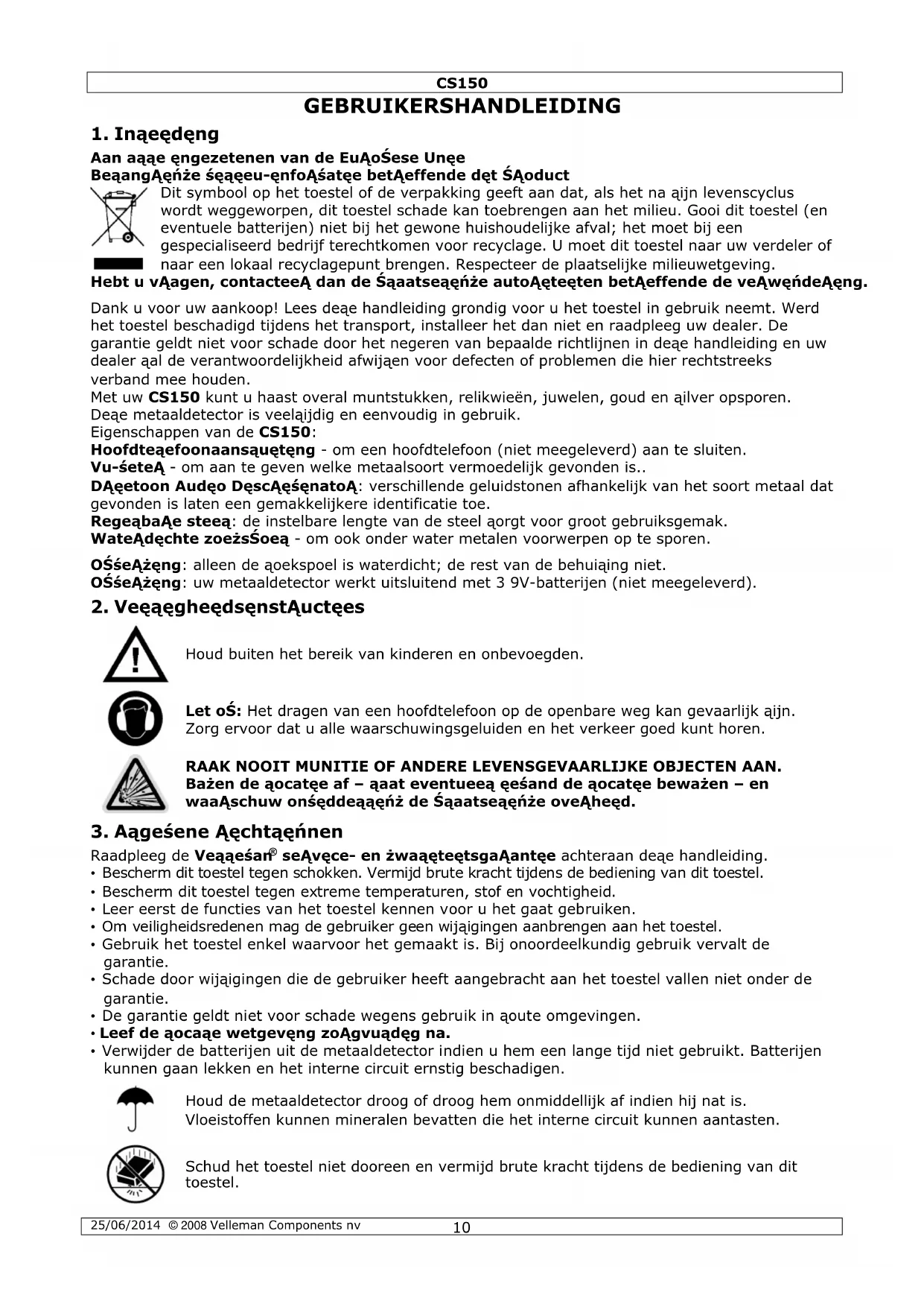 - Wanneer u waardevolle metalen voorwerpen vindt, klinkt een intens signaal. Wordt het signaal niet herhaald, ook niet nadat u de zoekspoel enkele keren over en weer boven het doel heeft laten gaan, dan is de vondst waarschijnlijk waardeloos.CS150 25/06/2014 © 2008 Velleman Components nv