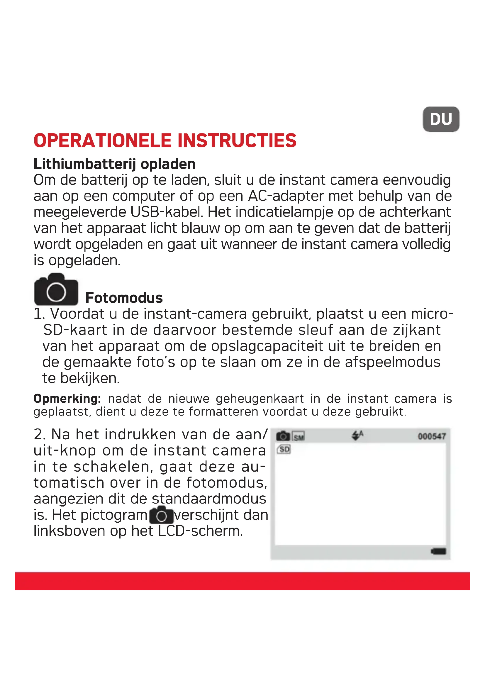uit-knop om de instant camera in te schakelen, gaat deze au- tomatisch over in de fotomodus, aangezien dit de standaardmodus is. Het pictogram verschijnt dan linksboven op het LCD-scherm.DU