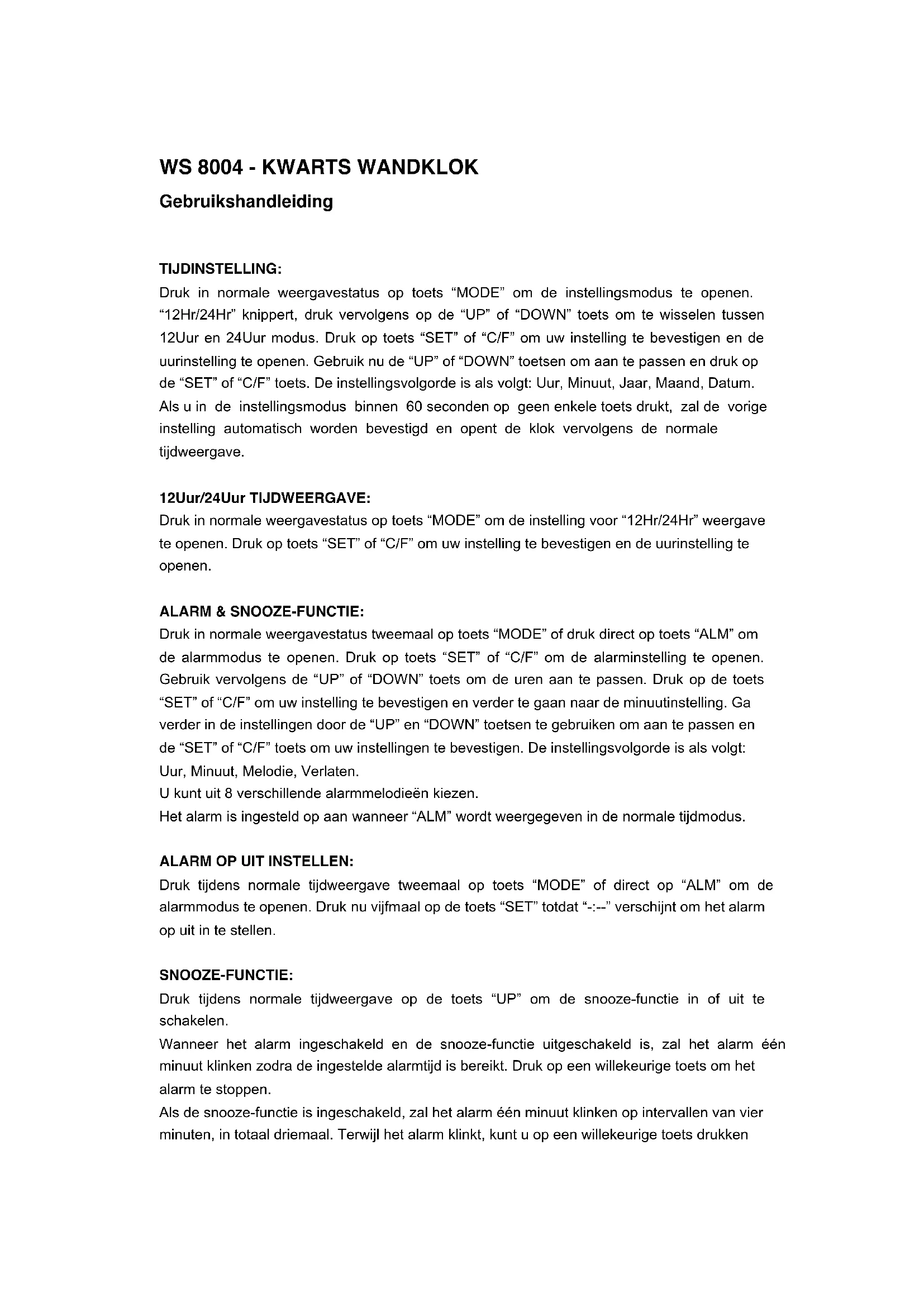 TIJDINSTELLING: Druk in normale weergavestatus op toets “MODE” om de instellingsmodus te openen. “12Hr/24Hr” knippert, druk vervolgens op de “UP” of “DOWN” toets om te wisselen tussen 12Uur en 24Uur modus. Druk op toets “SET” of “C/F” om uw instelling te bevestigen en de uurinstelling te openen. Gebruik nu de “UP” of “DOWN” toetsen om aan te passen en druk op de “SET” of “C/F” toets. De instellingsvolgorde is als volgt: Uur, Minuut, Jaar, Maand, Datum. Als u in de instellingsmodus binnen 60 seconden op geen enkele toets drukt, zal de vorige instelling automatisch worden bevestigd en opent de klok vervolgens de normale tijdweergave. 12Uur/24Uur TIJDWEERGAVE: Druk in normale weergavestatus op toets “MODE” om de instelling voor “12Hr/24Hr” weergave te openen. Druk op toets “SET” of “C/F” om uw instelling te bevestigen en de uurinstelling te openen. ALARM & SNOOZE-FUNCTIE: Druk in normale weergavestatus tweemaal op toets “MODE” of druk direct op toets “ALM” om de alarmmodus te openen. Druk op toets “SET” of “C/F” om de alarminstelling te openen. Gebruik vervolgens de “UP” of “DOWN” toets om de uren aan te passen. Druk op de toets “SET” of “C/F” om uw instelling te bevestigen en verder te gaan naar de minuutinstelling. Ga verder in de instellingen door de “UP” en “DOWN” toetsen te gebruiken om aan te passen en de “SET” of “C/F” toets om uw instellingen te bevestigen. De instellingsvolgorde is als volgt: Uur, Minuut, Melodie, Verlaten. U kunt uit 8 verschillende alarmmelodieën kiezen. Het alarm is ingesteld op aan wanneer “ALM” wordt weergegeven in de normale tijdmodus. ALARM OP UIT INSTELLEN: Druk tijdens normale tijdweergave tweemaal op toets “MODE” of direct op “ALM” om de alarmmodus te openen. Druk nu vijfmaal op de toets “SET” totdat “-:--” verschijnt om het alarm op uit in te stellen. SNOOZE-FUNCTIE: Druk tijdens normale tijdweergave op de toets “UP” om de snooze-functie in of uit te schakelen. Wanneer het alarm ingeschakeld en de snooze-functie uitgeschakeld is, zal het alarm één minuut klinken zodra de ingestelde alarmtijd is bereikt. Druk op een willekeurige toets om het alarm te stoppen. Als de snooze-functie is ingeschakeld, zal het alarm één minuut klinken op intervallen van vier minuten, in totaal driemaal. Terwijl het alarm klinkt, kunt u op een willekeurige toets drukkenom het te stoppen, het “SNOOZE” icoontje zal blijven knipperen om aan te geven dat het snooze-alarm nog steeds actief is. Het snooze-alarm werkt drie keer achtereenvolgens. Druk op “UP” om de snooze-functie uit te schakelen. VERJAARDAGHERINNERING INSTELLEN: Druk tijdens normale tijdweergave driemaal op de toets “MODE” om de verjaardag-herinneringmodus te openen. Druk op de toets “SET” of “C/F” om de instellingsmodus te openen voor de verjaardagherinnering. Gebruik vervolgens de “UP” of “DOWN” toets om de uren aan te passen. Druk op de toets “SET” of “C/F” om uw instelling te bevestigen en verder te gaan naar de minuutinstelling. Vervolg de instellingen nu door de “UP” of “DOWN” toets te gebruiken om aan te passen en de “SET” of “C/F” toets om uw instellingen te bevestigen. De instellingsvolgorde is als volgt: Uur, Minuut, Jaar, Maand, Datum, Verlaten. Wanneer de ingestelde tijd en datum zijn bereikt, zal de klok voor 5 minuten een verjaardagsliedje spelen om “LANG ZAL DIE LEVEN” te vieren. Als u de herinneringfunctie niet wilt gebruiken, kunt u een verlopen datum instellen. Als u in de instellingsmodus voor 60 seconden op geen enkele toets drukt, wordt de vorige instelling automatisch bevestigd en keert de klok automatisch terug op de normale tijdweergave. TIMERINSTELLING: Druk tijdens de normale tijdweergave viermaal op de toets “MODE” om de timermodus te openen. Druk op de toets “SET” of “C/F” om de timerinstelling te openen. Gebruik vervolgens de “UP” of “DOWN” toets om de uren aan te passen. Druk op de toets “SET” of “C/F” om uw instelling te bevestigen en verder te gaan naar de minuutinstelling. Stel nu de minuten in met de toetsen “UP” of “DOWN” en druk op de toets “SET” of “C/F” om uw instelling te bevestigen. Het instellingsbereik is Uur, Minuut (ca. 23 Uur : 59 Min). Nadat de minuutinstelling is bevestigd, begint de timer met aftellen. U kunt de timer stoppen en terugstellen door op de toets “SET” te drukken terwijl de timermodus wordt weergegeven. Wanneer de tijd is verlopen tot op 0:00:00, zal het alarm voor 1 minuut klinken en zal “0:00:00” knipperen op dezelfde tijd. Als u in de instellingsmodus voor 60 seconden op geen enkele toets drukt, wordt de vorige instelling automatisch bevestigd, de timer zal starten en de klok keert automatisch terug op de normale tijdweergave. TIMER OP UIT INSTELLEN: Druk tijdens de normale tijdweergave viermaal op de toets “MODE” om de timermodus te openen. Druk nu viermaal op “SET” totdat “-:--” verschijnt om de timer op uit in te stellen. TEMPERATUURWEERGAVE °C/°F: Druk in de normale weergavemodus op de toets “SET” of “C/F” om de °C/°F weergave te wisselen. MELODIEËN AFSPELEN: Druk tijdens normale tijdweergave op de toets “DOWN” om de muziekmarkering “(((。)))” in ofuit te schakelen. Wanneer de markering is ingeschakeld, worden de melodieën achtereenvolgens afgespeeld totdat u het uitschakelt door op de toets “DOWN” te drukken. Verklaring van conformiteit Technotrade verklaart hierbij dat dit product WS 8004 voldoet aan de essentiële vereisten en andere relevante bepalingen van Richtlijn 2014/53/EU en ROHS 2011/65/EC. De originele EU-conformiteitsverklaring is te vinden op: www.technoline.de/doc/4029665080048 VOORZORGSMAATREGELEN: x Dit hoofdapparaat is uitsluitend bestemd voor binnenshuis gebruik. x Stel het apparaat niet bloot aan overmatige krachten of schokken. x Stel het apparaat niet bloo