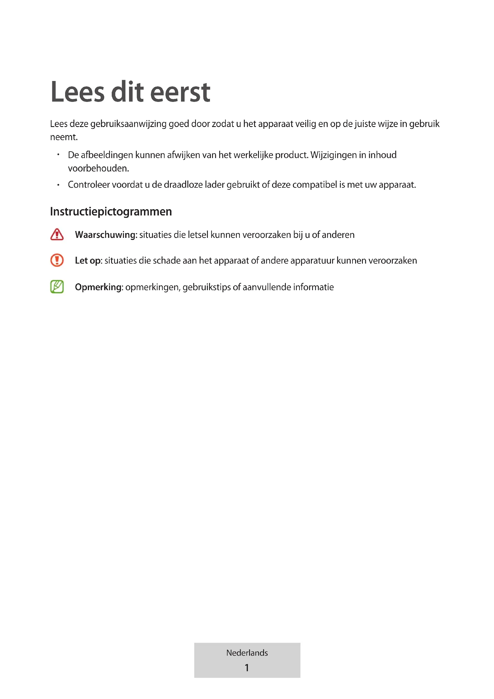 Het controlelampje werkt mogelijk anders, afhankelijk van het mobiele apparaat, de draadloze oplaadcover, de Galaxy Buds of de Galaxy Watch.11 Nederlands