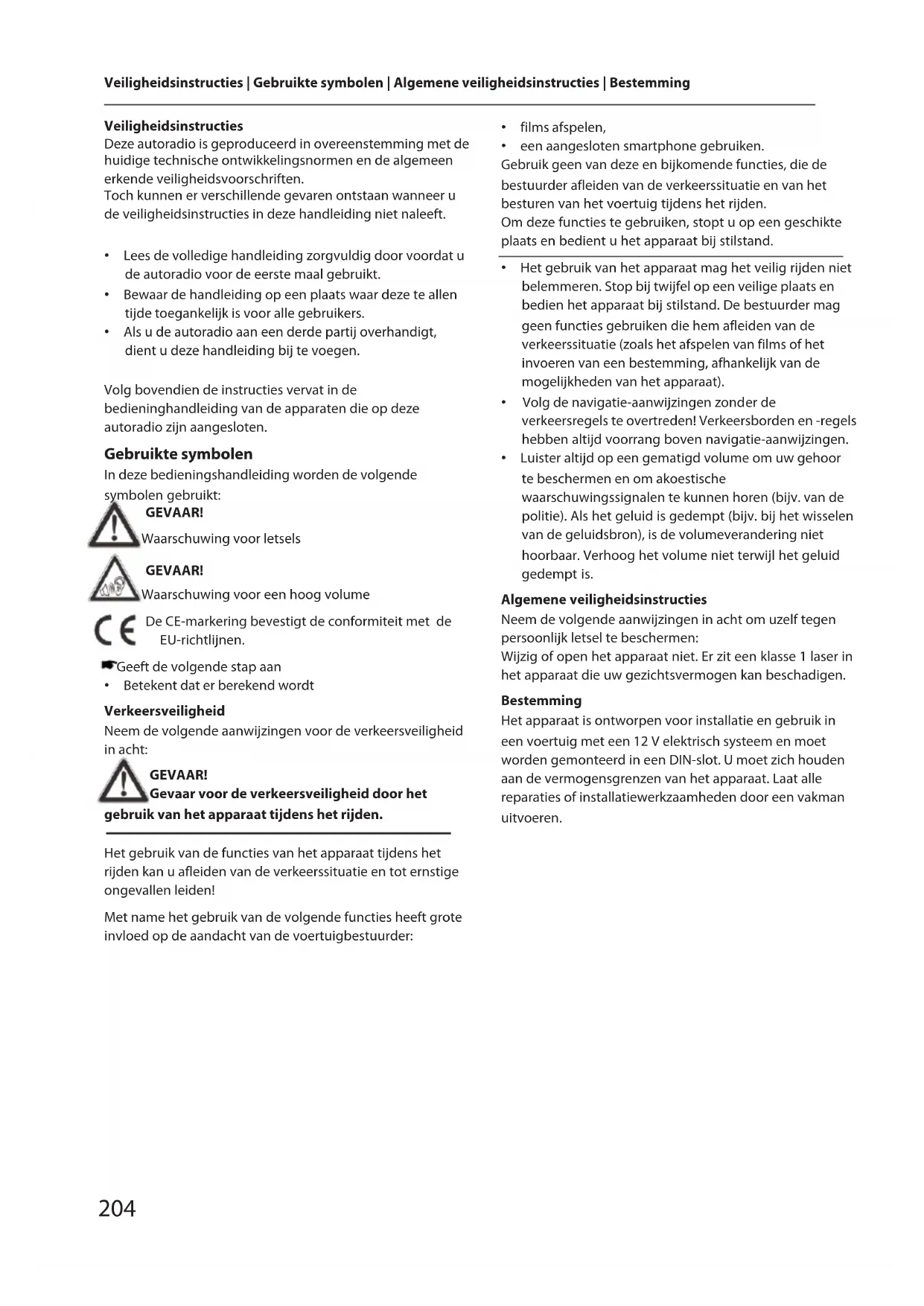 NEDERLANDS 203Veiligheidsinstructies | Gebruikte symbolen | Algemene veiligheidsinstructies | Bestemming Veiligheidsinstructies Deze autoradio is geproduceerd in overeenstemming met de huidige technische ontwikkelingsnormen en de algemeen erkende veiligheidsvoorschriften. Toch kunnen er verschillende gevaren ontstaan wanneer u de veiligheidsinstructies in deze handleiding niet naleeft.