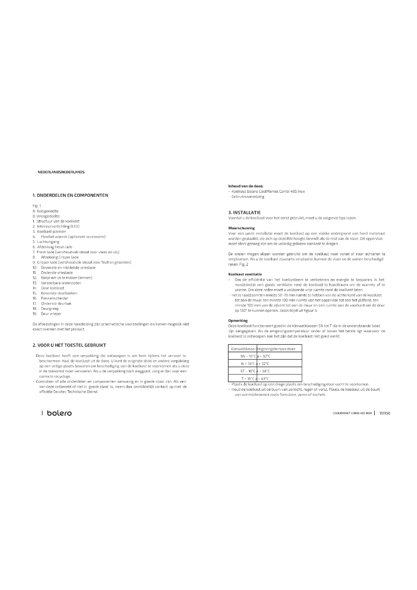 NEDERLANDS NEDERLANDS Inhoud van de doos: - Koelkast Bolero CoolMarket Combi 495 Inox - Gebruiksaanwijzing