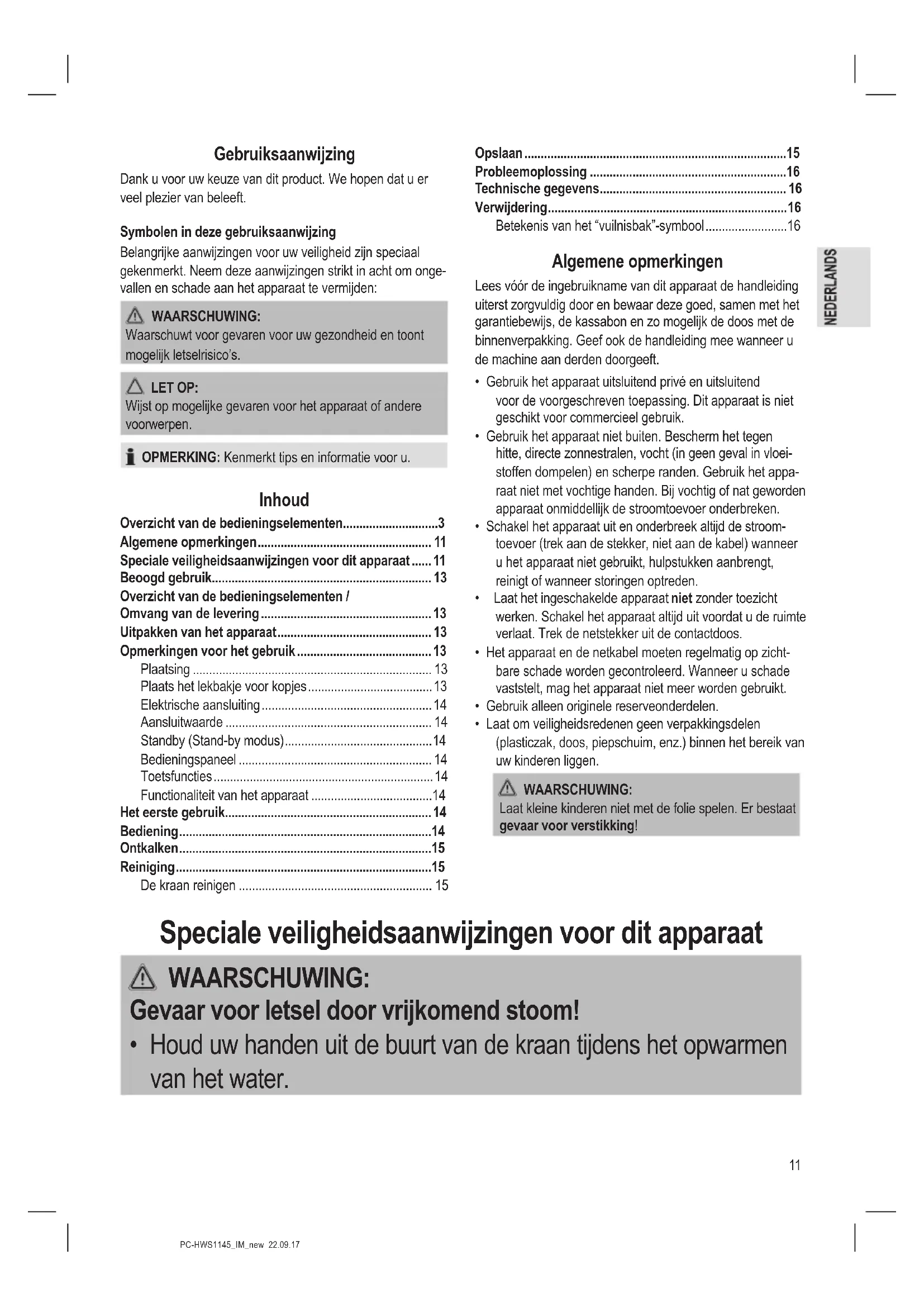 - Houd uw handen uit de buurt van de kraan tijdens het opwarmen van het water.12 PC-HWS1145_IM_new 22.09.17 WAARSCHUWING: Risico op brandwonden!