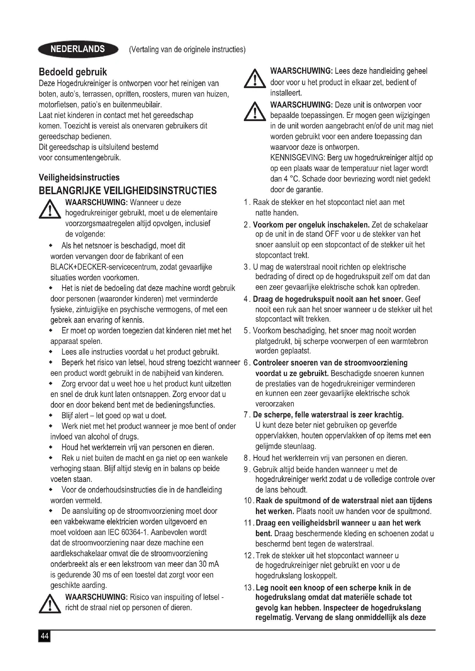 WAARSCHUWING: Wanneer u deze hogedrukreiniger gebruikt, moet u de elementaire voorzorgsmaatregelen altijd opvolgen, inclusief de volgende: Als het netsnoer is beschadigd, moet dit worden vervangen door de fabrikant of een BLACK+DECKER‑servicecentrum, zodat gevaarlijke situaties worden voorkomen. Het is niet de bedoeling dat deze machine wordt gebruik door personen (waaronder kinderen) met verminderde fysieke, zintuiglijke en psychische vermogens, of met een gebrek aan ervaring of kennis. Er moet op worden toegezien dat kinderen niet met het apparaat spelen. Lees alle instructies voordat u het product gebruikt. Beperk het risico van letsel, houd streng toezicht wanneer een product wordt gebruikt in de nabijheid van kinderen. Zorg ervoor dat u weet hoe u het product kunt uitzetten en snel de druk kunt laten ontsnappen. Zorg ervoor dat u door en door bekend bent met de bedieningsfuncties. Blijf alert – let goed op wat u doet. Werk niet met het product wanneer je moe bent of onder invloed van alcohol of drugs. Houd het werkterrein vrij van personen en dieren. Rek u niet buiten de macht en ga niet op een wankele verhoging staan. Blijf altijd stevig en in balans op beide voeten staan. Voor de onderhoudsinstructies die in de handleiding worden vermeld. De aansluiting op de stroomvoorziening moet door een vakbekwame elektricien worden uitgevoerd en moet voldoen aan IEC 60364‑1. Aanbevolen wordt dat de stroomvoorziening naar deze machine een aardlekschakelaar omvat die de stroomvoorziening onderbreekt als er een lekstroom van meer dan 30 mA is gedurende 30 ms of een toestel dat zorgt voor een geschikte aarding.