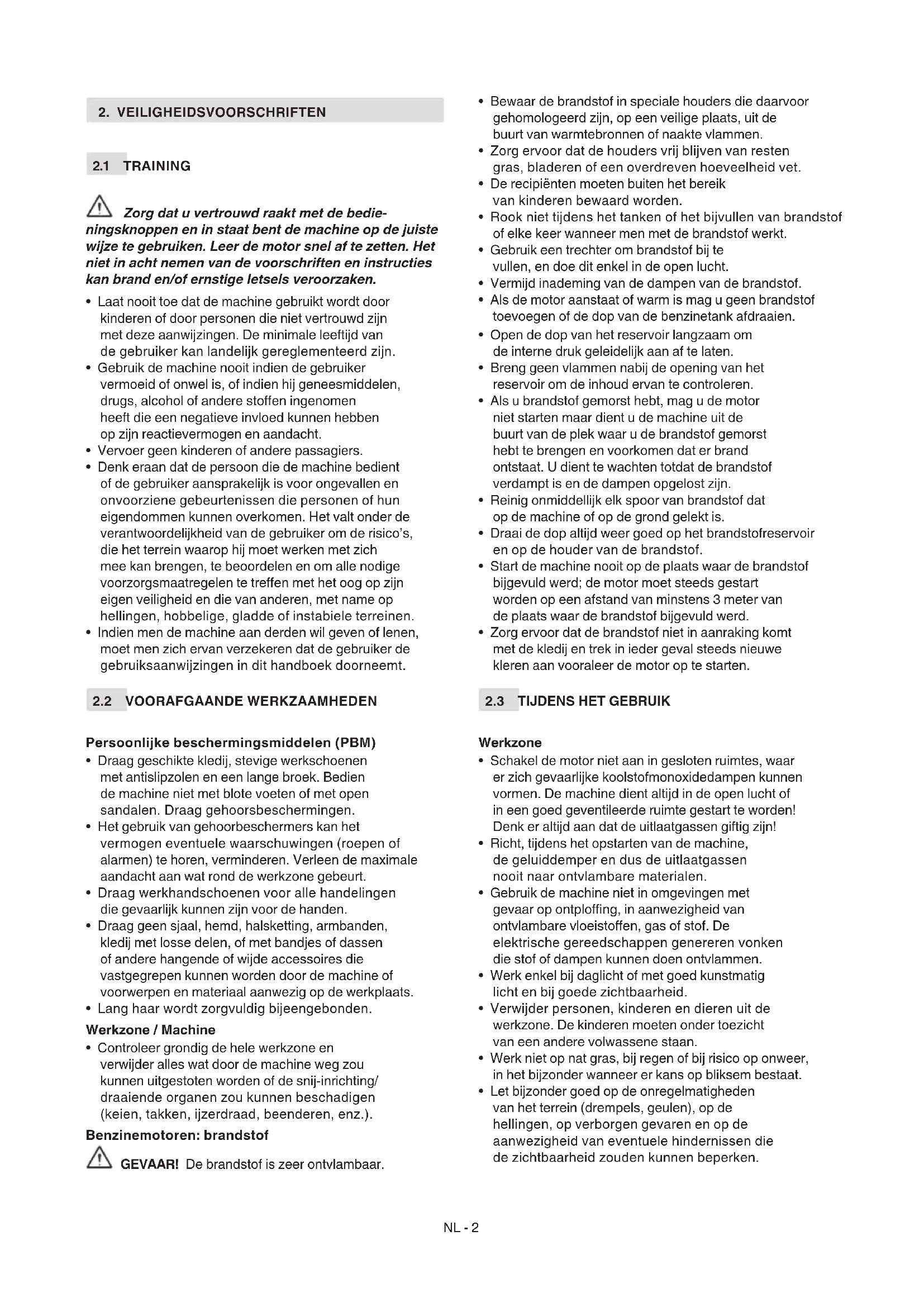 Er zijn verschillende symbolen op de machine aanwezig (afb.2.0). Hun taak is de bediener te herinneren aan het gedrag dat hij moet aanhouden om de machine met de nodige aandacht en voorzichtigheid te gebruiken. Betekenis van de symbolen: Let op: Lees de aanwijzingen alvorens de machine te gebruiken. Waarschuwing! Steek uw handen of voeten niet in de holte van de snij- inrichting. Maak de dop van de bougie los en lees de aanwijzingen vóór eender welke onderhoudswerkzaamheid of reparatie te verrichten. Gevaar! Risico op wegschietende voorwerpen. Houd de personen tijdens het gebruik buiten de werkzone. Gevaar! Gevaar voor snijwonden. Bewegende snij-inrichting. Steek uw handen of voeten niet in de holte van de snij-inrichting. BELANGRIJK De beschadigde of onleesbaar geworden labels moeten vervangen worden. Vraag nieuwe labels aan uw eigen geautoriseerd Dienstcentrum.