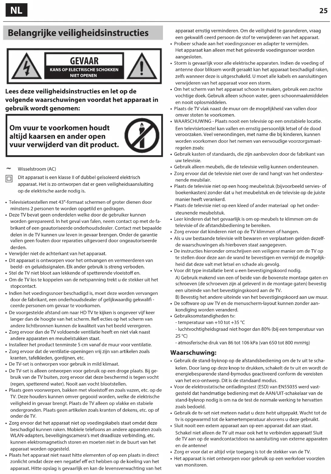 Lees deze veiligheidsinstructies en let op de volgende waarschuwingen voordat het apparaat in gebruik wordt genomen: Om vuur te voorkomen houdt altijd kaarsen en ander open vuur verwijderd van dit product. Wisselstroom (AC)Dit apparaat is een klasse II of dubbel geïsoleerd elektrisch apparaat. Het is zo ontworpen dat er geen veiligheidsaansluiting op de elektrische aarde nodig is.• Televisietoestellen met 43"-formaat schermen of groter dienen door minstens 2 personen te worden opgetild en gedragen.• Deze TV bevat geen onderdelen welke door de gebruiker kunnen worden gerepareerd. In het geval van falen, neem contact op met de fa-brikant of een geautoriseerde onderhoudsdealer. Contact met bepaalde delen in de TV kunnen uw leven in gevaar brengen. Onder de garantie vallen geen fouten door reparaties uitgevoerd door ongeautoriseerde derden.• Verwijder niet de achterkant van het apparaat.• Dit apparaat is ontworpen voor het ontvangen en vermeerderen van beeld- en geluidssignalen. Elk ander gebruik is streng verboden.• Stel de TV niet bloot aan lekkende of spetterende vloeistoff en.• Om de TV los te koppelen van de netspanning trekt u de stekker uit het stopcontact.• Indien het voedingssnoer beschadigd is, moet deze worden vervangen door de fabrikant, een onderhoudsdealer of gelijkwaardig gekwali -ceerde personen om gevaar te voorkomen.• De voorgestelde afstand om naar HD TV te kijken is ongeveer vijf keer langer dan de hoogte van het scherm. Re ecties op het scherm van andere lichtbronnen kunnen de kwaliteit van het beeld verergeren.• Zorg ervoor dan de TV voldoende ventilatie heeft en niet vlak naast andere apparaten en meubelstukken staat.• Installeer het product tenminste 5 cm vanaf de muur voor ventilatie.• Zorg ervoor dat de ventilatie-openingen vrij zijn van artikelen zoals kranten, tafelkleden, gordijnen, etc.• De TV-set is ontworpen voor gebruik in mild klimaat.• De TV-set is alleen ontworpen voor gebruik op een droge plaats. Bij ge-bruik van de TV buiten, zorg ervoor dat deze beschermd is tegen vocht (regen, spetterend water). Nooit aan vocht blootstellen.• Plaats geen voorwerpen, bakken met vloeistoff en zoals vazen, etc. op de TV. Deze houders kunnen omver gegooid worden, welke de elektrische veiligheid in gevaar brengt. Plaats de TV alleen op vlakke en stabiele ondergronden. Plaats geen artikelen zoals kranten of dekens, etc. op of onder de TV.• Zorg ervoor dat het apparaat niet op voedingskabels staat omdat deze beschadigd kunnen raken. Mobiele telefoons an andere apparaten zoals WLAN-adapters, beveiligingscamera’smet draadloze verbinding, etc. kunnen elektromagnetisch storen en moeten niet in de buurt van het apparaat worden opgesteld.• Plaats het apparaat niet naast hitte elementen of op een plaats in direct zonlicht omdat deze een negatief eff ect hebben op de koeling van het apparaat. Hitte opslag is gevaarlijk en kan de levensverwachting van het apparaat ernstig verminderen. Om de veiligheid te garanderen, vraag een gekwali ceerd persoon de stof te verwijderen van het apparaat.• Probeer schade aan het voedingssnoer en adapter te vermijden. Het apparaat kan alleen met het geleverde voedingssnoer worden aangesloten.• Storm is gevaarlijk voor alle elektrische apparaten. Indien de voeding of antenne door bliksem wordt geraakt kan het apparaat beschadigd raken, zelfs wanneer deze is uitgeschakeld. Umoet alle kabels en aansluitingen verwijderen van het apparaat voor een storm.• Om het scherm van het apparaat schoon te maken, gebruik een zachte vochtige doek. Gebruik alleen schoon water, geen schoonmaakmiddelen en nooit oplosmiddelen.• Plaats de TV vlak naast de muur om de mogelijkheid van vallen door omver stoten te voorkomen.• WAARSCHUWING - Plaats nooit een televisie op een onstabiele locatie. Een televisietoestel kan vallen en ernstig persoonlijk letsel of de dood veroorzaken. Veel verwondingen, met name die bij kinderen, kunnen worden voorkomen door het nemen van eenvoudige voorzorgsmaat-regelen zoals:• Gebruik kasten of standaards, die zijn aanbevolen door de fabrikant van uw televisie.• Gebruik alleen meubels, die de televisie veilig kunnen ondersteunen.• Zorg ervoor dat de televisie niet over de rand hangt van het ondersteu-nende meubilair.• Plaats de televisie niet op een hoog meubelstuk (bijvoorbeeld servies- of boekenkasten) zonder dat u het meubelstuk en de televisie op de juiste manier heeft verankerd.• Plaats de televisie niet op een kleed of ander materiaal op het onder-steunende meubelstuk.• Leer kinderen dat het gevaarlijk is om op meubels te klimmen om de televisie of de afstandsbediening te bereiken.• Zorg ervoor dat kinderen niet op de TV klimmen of hangen.• Als u uw bestaande televisie wilt bewaren en verplaatsen gelden dezelf-de waarschuwingen als hierboven staat aangegeven.• De instructies hieronder omschrijven een veiligere manier om de TV op te stellen door deze aan de wand te bevestigen en vermijd de mogelijk-heid dat deze valt met letsel en schade als gevolg.• Voor dit type installatie bent ueen bevestigingskoord nodig.A) Gebruik makend van een of beide van de bovenste montage gaten en schroeven (de schroeven zijn al geleverd in de montage gaten) bevestig een uiteinde van het bevestigingskoord aan de TV.B) Bevestig het andere uiteinde van het bevestigingskoord aan uw muur.• De software op uw TV en de menuscherm-layout kunnen zonder aan-kondiging worden veranderd.• Gebruiksomstandigheden tv:- temperatuur van +10 tot +35 °C- luchtvochtigheidsgraad niet hoger dan 80% (bij een temperatuur van 25 °C)- atmosferische druk van 86 tot 106 kPa (van 650 tot 800 mmHg) Waarschuwing: