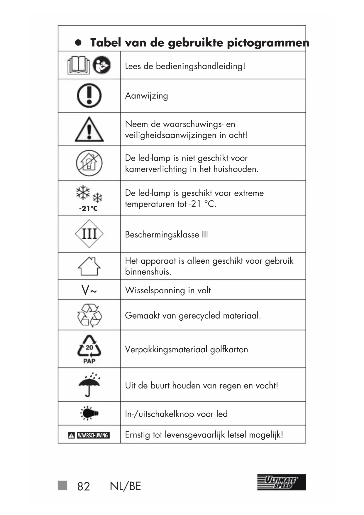 Wisselspanning in volt Gemaakt van gerecycled materiaal. Verpakkingsmateriaal golfkarton Uit de buurt houden van regen en vocht! In-/uitschakelknop voor led WAARSCHUWING Ernstig tot levensgevaarlijk letsel mogelijk!NL/BE