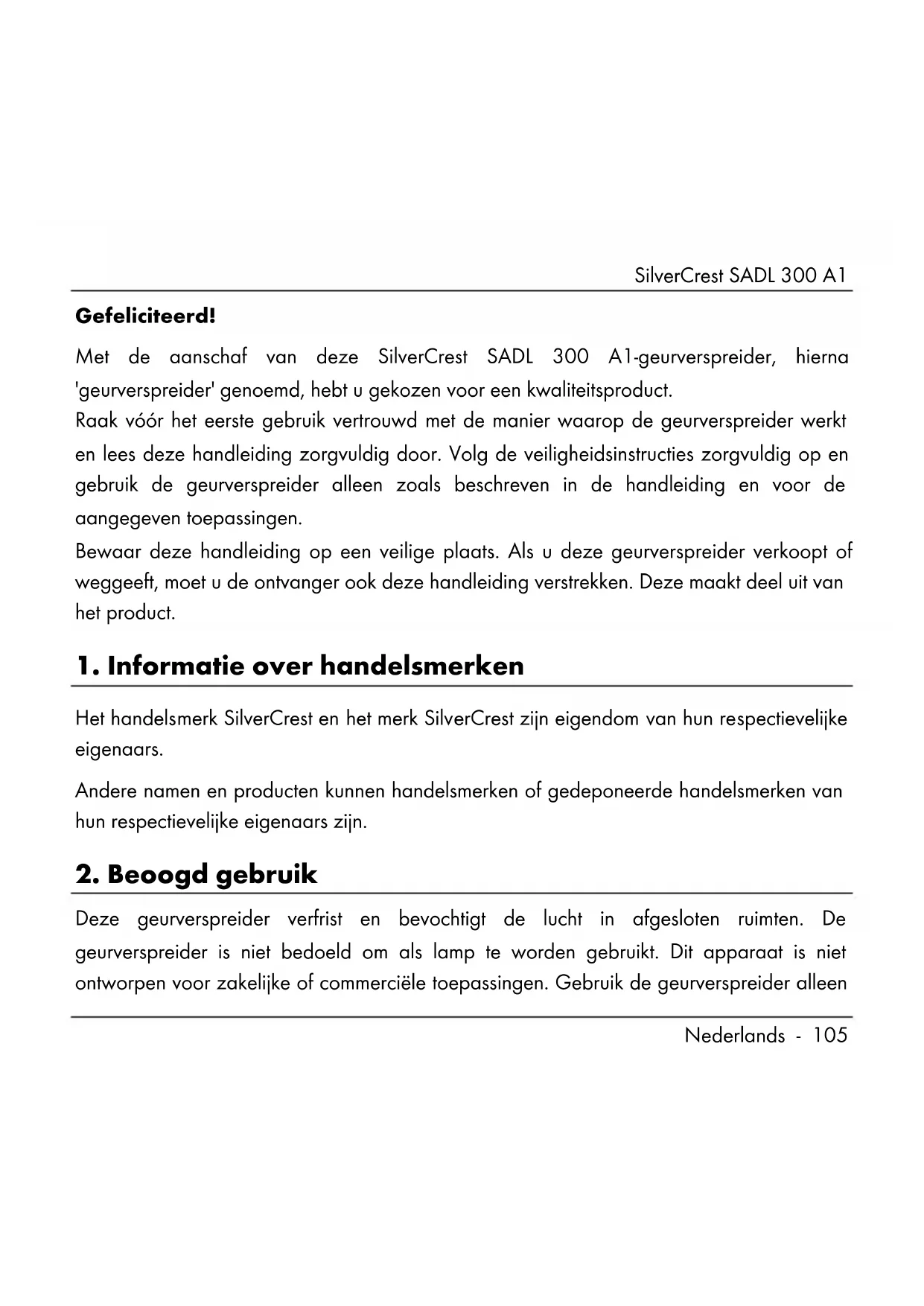 Nederlands - 105 Gefeliciteerd! Met de aanschaf van deze SilverCrest SADL 300 A1-geurverspreider, hierna 'geurverspreider' genoemd, hebt u gekozen voor een kwaliteitsproduct. Raak vóór het eerste gebruik vertrouwd met de manier waarop de geurverspreider werkt en lees deze handleiding zorgvuldig door. Volg de veiligheidsinstructies zorgvuldig op en gebruik de geurverspreider alleen zoals beschreven in de handleiding en voor de aangegeven toepassingen. Bewaar deze handleiding op een veilige plaats. Als u deze geurverspreider verkoopt of weggeeft, moet u de ontvanger ook deze handleiding verstrekken. Deze maakt deel uit van het product.