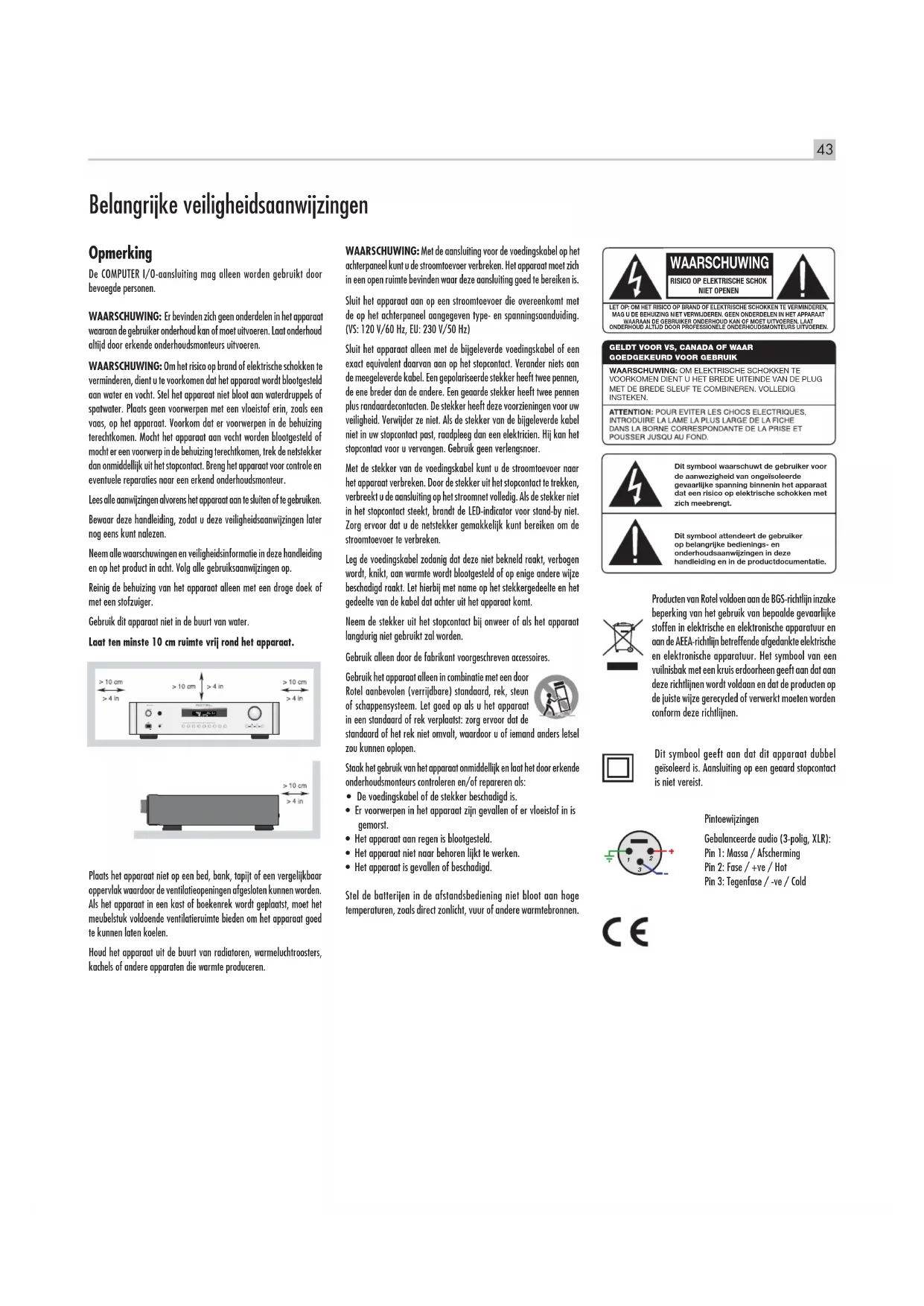 - VOORKOMEN DIENT U HET BREDE UITEINDE VAN DE PLUG MET DE BREDE SLEUF TE COMBINEREN. VOLLEDIG INSTEKEN. Dit symbool waarschuwt de gebruiker voor de aanwezigheid van ongeïsoleerde gevaarlijke spanning binnenin het apparaat dat een risico op elektrische schokken met zich meebrengt. Dit symbool attendeert de gebruiker op belangrijke bedienings- en onderhoudsaanwijzingen in deze handleiding en in de productdocumentatie.44 RC‑1570 Stereo‑regelversterker Over Rotel Ons verhaal is meer dan 50 jaar geleden begonnen. Door de jaren heen hebben we met onze producten honderden prijzen gewonnen en hebben honderdduizenden mensen van onze producten kunnen genieten. Mensen die net als u hoogwaardige apparatuur voor home-entertainment op waarde weten te schatten. Rotel is opgericht door een familie met een passie voor muziek die hifiapparatuur van de allerhoogste kwaliteit is gaan maken. Na al die jaren is die passie er nog steeds. Nog altijd is ons doel meerwaarde bieden aan muziekliefhebbers en hifikenners, ongeacht hun budget. Dit doel wordt gedeeld door alle medewerkers van Rotel. De ontwikkelaars van Rotel werken als één team samen. Ze luisteren zorgvuldig naar elk nieuw product en blijven het bijschaven tot het aan hun hoge eisen voldoet. Ze kunnen componenten van overal ter wereld kiezen om het optimale product te maken, zoals condensatoren uit het Verenigd Koninkrijk en Duitsland, halfgeleiders uit Japan of de VS, terwijl de ringkerntransformatoren altijd in Rotels eigen fabrieken worden vervaardigd. Het milieu gaat ons allemaal aan het hart. Omdat er steeds meer elektronica wordt geproduceerd, wordt het voor fabrikanten steeds belangrijker er alles aan te doen producten zo te ontwerpen dat deze het milieu zo min mogelijk belasten. Bij Rotel zijn we er trots op dat we hieraan ons steentje kunnen bijdragen. Om het loodgehalte in onze producten te verlagen, zijn we overgestapt op speciaal loodvrij soldeermiddel dat voldoet aan de BGS-richtlijn en op loodvrije componenten. Onze ontwikkelaars verbeteren voortdurend de efciency van onze voedingen, zonder concessies te doen aan kwaliteit. Als ze op stand-by staan, gebruiken producten van Rotel zeer weinig stroom en voldoen zo aan internationale eisen voor stand-by stroomverbruik. Ook de Rotel-fabriek draagt een steentje bij aan een beter milieu door de assemblagemethoden steeds verder te verbeteren, om zo tot een schoner en groener productieproces te komen. Namens Rotel willen wij u bedanken dat u dit product hebt aangeschaft. Wij weten zeker dat u er vele jaren plezier van zult hebben. Aan de slag U hebt de stereo-regelversterker RC-1570 van Rotel aangeschaft. Dank u wel daarvoor. Als u dit product van Rotel combineert met een hoogwaardig audiosysteem bent u verzekerd van jarenlang muziekplezier. De RC-1570 is een hoogwaardige component met uitgebreide functies. Alle aspecten van het ontwerp zijn ervoor geoptimaliseerd om het volledige dynamische bereik en de subtiele nuances van uw muziek te behouden. De RC-1570 heeft een sterk gereguleerde voeding met een speciaal door Rotel ontworpen ringkerntransformator en maatwerkcondensatoren. Deze voeding met lage impedantie heeft voldoende voedingsreserves, waardoor de RC-1570 met het grootste gemak zelfs de meest veeleisende audiosignalen kan reproduceren. Dit type ontwerp is kostbaarder in productie, maar levert een beter muzikaal resultaat op. Inhoud Afbeelding 1: Bedieningselementen en aansluitingen 3 Afbeelding 2: Afstandsbediening RR-AX92 3 Afbeelding 3: Analoge ingangen en uitgangen 4 Afbeelding 4: Gebalanceerde ingangen (XLR) en uitgangen 5 Afbeelding 5: Digitale ingangen en 12V-triggeruitgang 6 Afbeelding 6: USB-ingang op het voorpaneel 7 Héél belangrijk 8 Belangrijke veiligheidsaanwijzingen p. 43