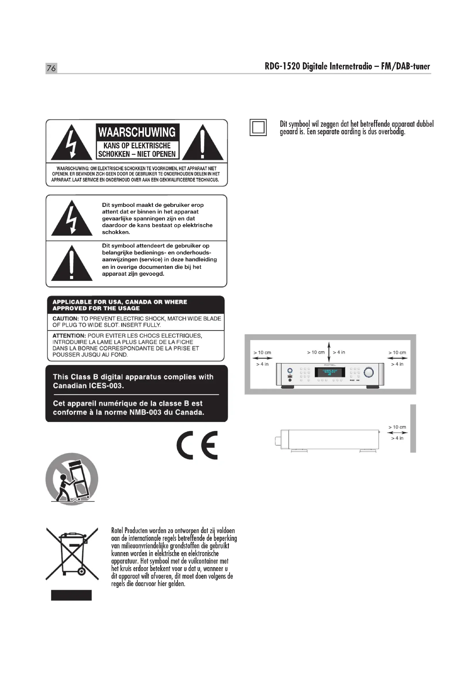 - AMPLIFIER WI-FI DONGLE RDG1520_ENG_SPA_FRE_GER_DUT_ITA_RUS_SWE.indb 79 27/8/10 13:07:4080 RDG-1520 Digitale Internetradio – FM/DAB-tuner Wij van Rotel Onze geschiedenis begon bijna 50 jaar geleden. Gedurende die tijd mochten we honderden onderscheidingen ontvangen en hebben we honderdduizenden mensen, die hun thuisamusement serieus nemen – zoals u – gelukkig kunnen maken. Rotel werd opgericht door een familie met een gepassioneerde betrokkenheid bij muziek, die hen leidde tot het produceren van geluidsapparatuur van onberispelijke kwaliteit. In de loop der jaren is die passie onveranderd gebleven en het familiedoel om audiofielen en muziekliefhebbers, ongeacht hun budget, topkwaliteit te bieden, wordt nog steeds door iedere Rotel-medewerker gesteund. Rotel’s technici werken als een hecht team al tweakend en luisterend totdat ieder nieuw product dat muzikale niveau heeft bereikt, dat hun bij de aanvang van het project voor ogen stond. Zij worden volkomen vrijgelaten in hun keuze van componenten, waar ze ook op de wereld vandaan moeten komen. In Rotel apparatuur kunt u condensatoren tegenkomen uit Duitsland en Engeland, of half geleiders uit Amerika en Japan. De ringkerntransformatoren komen echter altijd uit eigen huis. We maken ons allemaal zorgen over het milieu. Daar er steeds meer elektronicaproducten worden gefabriceerd en ook later weer worden afgedankt, is het voor een fabrikant van het grootste belang om er alles aan te doe, producten te vervaardigen die een zo min mogelijk negatieve impact hebben op natuur en grondwater. Bij Rotel zijn we er trots op ons steentje te kunnen bijdragen. We hebben bijvoorbeeld het aandeel lood in onze elektronica aanzienlijk teruggebracht door over te stappen op een speciaal ROHS (Restriction of Hazardous Substances) soldeer, terwijl wij onze klasse D (niet de D van digitaal) versterkers vijfmaal zo efficiënt gemaakt hebben t.o.v. onze vroegere ontwerpen, met handhaving van vermogen en prestatie. Ze blijven koel, vermorsen vrijwel geen energie meer, zijn dus minder belastend voor het milieu en klinken nog beter ook! Tussen twee haakjes, deze handleiding is gedrukt op hergebruikt papier. Wij realiseren ons dat dit de eerste stapjes zijn, maar ze zijn voor ons zeer belangrijk en we blijven nieuwe wegen en materialen zoeken voor een schonere en meer “groene” productiewijze. Door de aanschaf van dit product danken wij u voor het in ons gestelde vertrouwen en wensen wij u er veel en langdurig plezier mee. Inhoud Belangrijke Veiligheidsinstructies p. 77