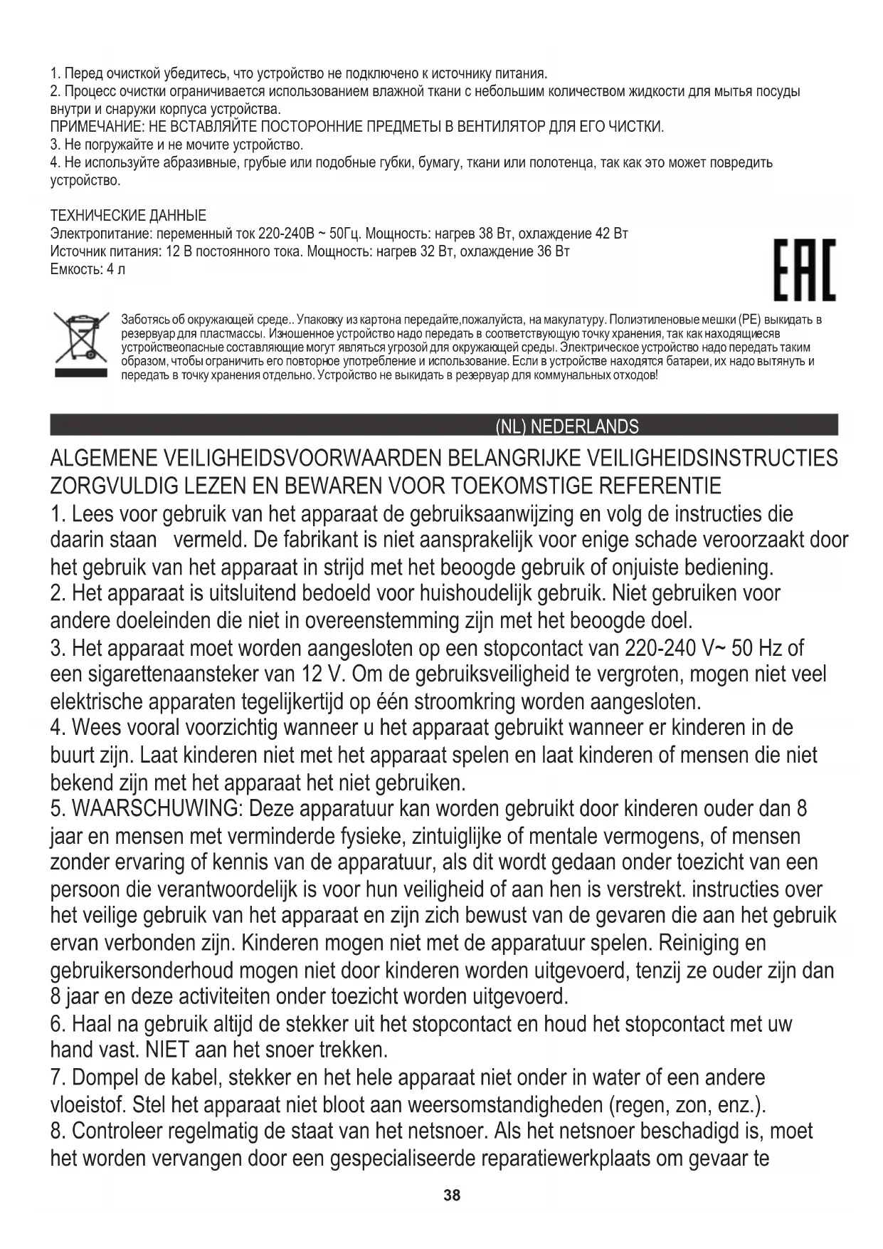 3. Zet na het beëindigen van de bewerking de modusschakelaar (2A) en spanningsschakelaar (2B) op "OFF" en koppel de draden los. TECHNISCHE DATA 4. Gebruik geen schurende, ruwe of andere soortgelijke sponzen, papier, doeken of handdoeken, aangezien dit het apparaat kan beschadigen. 2. Het reinigingsproces is beperkt tot het gebruik van een vochtige doek met een beetje afwasmiddel aan de binnen- en buitenkant van de behuizing van het apparaat. OPMERKING: PLAATS GEEN BUITENLANDSE VOORWERPEN IN DE VENTILATOR OM DEZE TE REINIGEN. Voeding: AC 220-240V ~ 50Hz. Vermogen: verwarming 38W, koeling 42W Voeding: DC 12V. Vverwarming 32W, koeling 36W ermogen: