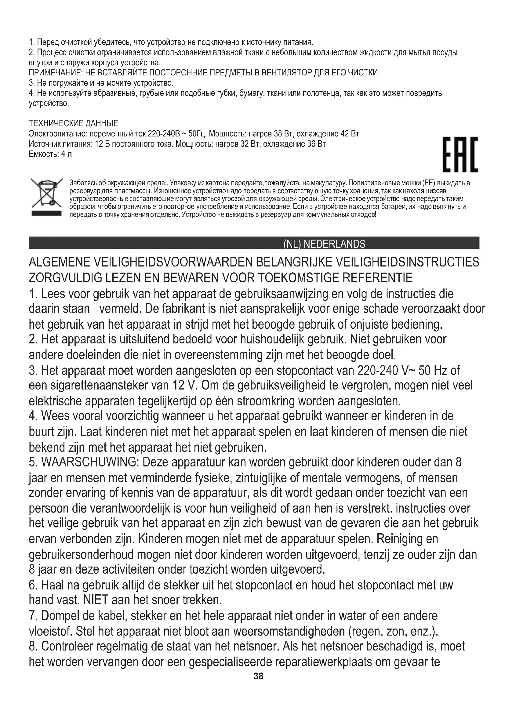 d) Zet de modusschakelaar (2A) op: "HOT" als u de kamer wilt verwarmen of op "COLD" om de kamer te koelen. Met 12V DC voeding: Met AC220-240V voeding: a) Steek de connector in de AC-sleuf (2D). a) Steek het andere uiteinde van de kabel met de stekker (1C) in de sigarettenaanstekeraansluiting. b) Zet de spanningsschakelaar (2B) op AC. Het stroomverbruik bij elke instelling is als volgt: c) Steek het andere uiteinde van de kabel met de stekker (1D) in het stopcontact. Het stroomverbruik bij elke instelling is als volgt: AC: Verwarmingsmodus 38W / Koelmodus 42W 3. Zet na het beëindigen van de bewerking de modusschakelaar (2A) en spanningsschakelaar (2B) op "OFF" en koppel de draden los. d) Zet de modusschakelaar (2A) op: "HOT" als u de kamer wilt verwarmen of op "COLD" om de kamer te koelen. WAARSCHUWING: Schakel de modusschakelaar (2A) niet abrupt om. Schakel de functie na 30 minuten in-stand om: UIT. ermogen: 4. Gebruik geen schurende, ruwe of andere soortgelijke sponzen, papier, doeken of handdoeken, aangezien dit het apparaat kan beschadigen. TECHNISCHE DATA Voeding: DC 12V. Vverwarming 32W, koeling 36W Voeding: AC 220-240V ~ 50Hz. Vermogen: verwarming 38W, koeling 42W Capaciteit: 4L