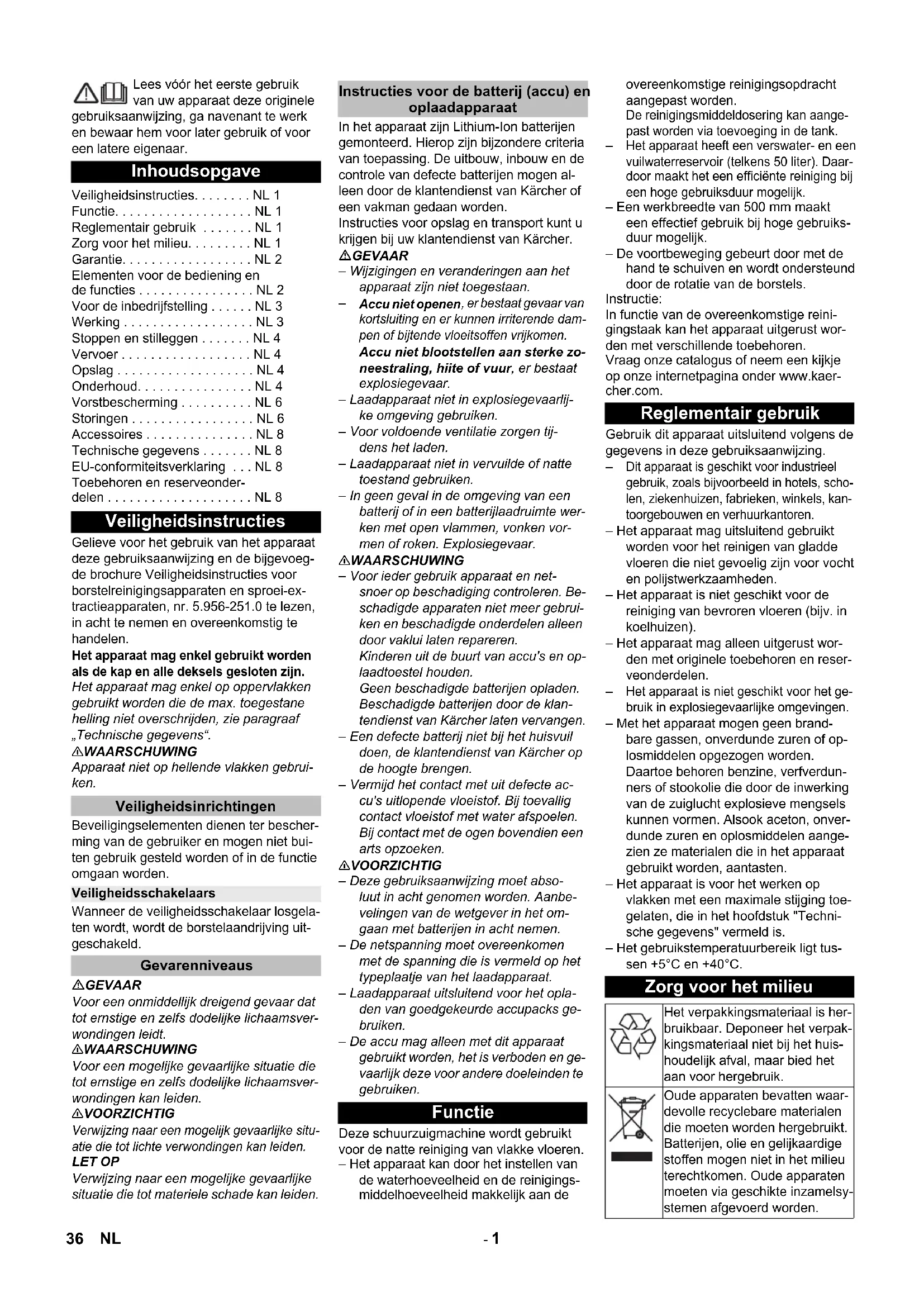 Accu niet openen , er bestaat gevaar van kortsluiting en er kunnen irriterende dam- pen of bijtende vloeitsoffen vrijkomen. Accu niet blootstellen aan sterke zo- neestraling, hiite of vuur, er bestaat explosiegevaar. – Laadapparaat niet in explosiegevaarlij- ke omgeving gebruiken. – Voor voldoende ventilatie zorgen tij- dens het laden. – Laadapparaat niet in vervuilde of natte toestand gebruiken. – In geen geval in de omgeving van een batterij of in een batterijlaadruimte wer- ken met open vlammen, vonken vor- men of roken. Explosiegevaar. 몇 WAARSCHUWING – Voor ieder gebruik apparaat en net- snoer op beschadiging controleren. Be- schadigde apparaten niet meer gebrui- ken en beschadigde onderdelen alleen door vaklui laten repareren. Kinderen uit de buurt van accu's en op- laadtoestel houden. Geen beschadigde batterijen opladen. Beschadigde batterijen door de klan- tendienst van Kärcher laten vervangen. – Een defecte batterij niet bij het huisvuil doen, de klantendienst van Kärcher op de hoogte brengen. – Vermijd het contact met uit defecte ac- cu's uitlopende vloeistof. Bij toevallig contact vloeistof met water afspoelen. Bij contact met de ogen bovendien een arts opzoeken. 몇 VOORZICHTIG – Deze gebruiksaanwijzing moet abso- luut in acht genomen worden. Aanbe- velingen van de wetgever in het om- gaan met batterijen in acht nemen. – De netspanning moet overeenkomen met de spanning die is vermeld op het typeplaatje van het laadapparaat. – Laadapparaat uitsluitend voor het opla- den van goedgekeurde accupacks ge- bruiken. – De accu mag alleen met dit apparaat gebruikt worden, het is verboden en ge- vaarlijk deze voor andere doeleinden te gebruiken. Deze schuurzuigmachine wordt gebruikt voor de natte reiniging van vlakke vloeren. – Het apparaat kan door het instellen van de waterhoeveelheid en de reinigings- middelhoeveelheid makkelijk aan de overeenkomstige reinigingsopdracht aangepast worden. De reinigingsmiddeldosering kan aange- past worden via toevoeging in de tank.
