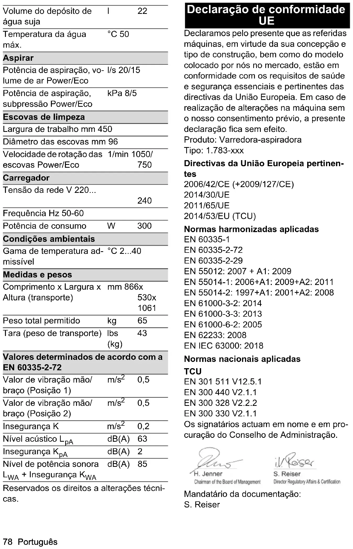 - dB(A) 85Nederlands 79 Alfred Kärcher SE & Co. KG Alfred-Kärcher-Str. 28 - 40 71364 Winnenden (Alemanha) Tel.: +49 7195 14-0 Fax: +49 7195 14-2212 Winnenden, 01/02/2021 Garantia Em cada país são válidas as condições de garantia transmitidas pela nossa socieda- de distribuidora responsável. Trataremos de possíveis avarias no seu aparelho no âmbito do prazo da garantia, sem custos, desde que estas tenham origem num erro de material ou de fabrico. Em caso de ga- rantia, contacte o seu revendedor ou a as- sistência técnica autorizada mais próxima, apresentando o talão de compra. (endereço consultar o verso) Para mais informações sobre a garantia (se disponíveis), consultar "Transferên- cias" na área de serviço do website local da Kärcher. Inhoud Algemene instructies Voordat u het apparaat voor het eerst ge- bruikt, dient u deze originele gebruiksaan- wijzing en de meegeleverde veiligheidsinstructies door te lezen en deze in acht te nemen. Bewaar beide documenten voor later ge- bruik of volgende eigenaars. Veiligheidsinstructies Lees vóór het eerste gebruik van het appa- raat deze gebruiksaanwijzing en de bijbe- horende brochure Veiligheidsinstructies voor borstelreinigingsapparaten, nr. 5.956- 251.0, neem deze in acht en handel dien- overeenkomstig. 몇 WAARSCHUWING Het apparaat kan omkantelen Gevaar van letsels Gebruik het apparaat niet op hellende vlak- ken. 몇 WAARSCHUWING Gevaren voor ongevallen door foute be- diening Personen kunnen gewond raken. Bedieners moeten adequaat in het gebruik van het apparaat worden geïnstrueerd. Het apparaat mag alleen worden gebruikt, als de kap en alle deksel gesloten zijn. Gevarenniveaus GEVAAR ● Aanwijzing voor direct dreigend gevaar dat tot zware of dodelijke verwondingen leidt. 몇 WAARSCHUWING ● Aanwijzing voor een mogelijk gevaarlijke situatie die tot zware of dodelijke verwon- dingen kan leiden. 몇 VOORZICHTIG ● Aanwijzing voor een mogelijk gevaarlijke situatie die tot lichte verwondingen kan leiden. LET OP ● Aanwijzing voor een mogelijk gevaarlijke situatie die tot materiële schade kan lei- den. Batterij Dit apparaat bevat een lithium-ion-batterij, waarvoor speciale vereisten gelden. Het verwijderen, installeren en testen van de- fecte batterijen mag uitsluitend door de klantenservice van Kärcher of door een ge- kwalificeerde expert worden uitgevoerd. Algemene instructies p. 79
