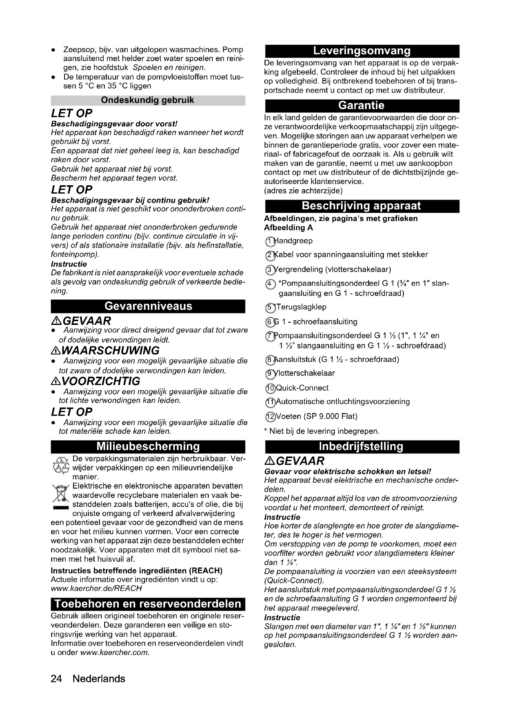 - EU-conformiteitsverklaring Nederlands ● Zeepsop, bijv. van uitgelopen wasmachines. Pomp aansluitend met helder zoet water spoelen en reini- gen, zie hoofdstuk Spoelen en reinigen. ● De temperatuur van de pompvloeistoffen moet tus- sen 5 °C en 35 °C liggen Ondeskundig gebruik LET OP Beschadigingsgevaar door vorst! Het apparaat kan beschadigd raken wanneer het wordt gebruikt bij vorst. Een apparaat dat niet geheel leeg is, kan beschadigd raken door vorst. Gebruik het apparaat niet bij vorst. Bescherm het apparaat tegen vorst. LET OP Beschadigingsgevaar bij continu gebruik! Het apparaat is niet geschikt voor ononderbroken conti- nu gebruik. Gebruik het apparaat niet ononderbroken gedurende lange perioden continu (bijv. continue circulatie in vij- vers) of als stationaire installatie (bijv. als hefinstallatie, fonteinpomp). Instructie De fabrikant is niet aansprakelijk voor eventuele schade als gevolg van ondeskundig gebruik of verkeerde bedie- ning. Gevarenniveaus GEVAAR ● Aanwijzing voor direct dreigend gevaar dat tot zware of dodelijke verwondingen leidt. 몇 WAARSCHUWING ● Aanwijzing voor een mogelijk gevaarlijke situatie die tot zware of dodelijke verwondingen kan leiden. 몇 VOORZICHTIG ● Aanwijzing voor een mogelijk gevaarlijke situatie die tot lichte verwondingen kan leiden. LET OP ● Aanwijzing voor een mogelijk gevaarlijke situatie die tot materiële schade kan leiden. Milieubescherming De verpakkingsmaterialen zijn herbruikbaar. Ver- wijder verpakkingen op een milieuvriendelijke manier. Elektrische en elektronische apparaten bevatten waardevolle recyclebare materialen en vaak be- standdelen zoals batterijen, accu's of olie, die bij onjuiste omgang of verkeerd afvalverwijdering een potentieel gevaar voor de gezondheid van de mens en voor het milieu kunnen vormen. Voor een correcte werking van het apparaat zijn deze bestanddelen echter noodzakelijk. Voer apparaten met dit symbool niet sa- men met het huisvuil af. Instructies betreffende ingrediënten (REACH) Actuele informatie over ingrediënten vindt u op: www.kaercher.de/REACH Toebehoren en reserveonderdelen Gebruik alleen origineel toebehoren en originele reser- veonderdelen. Deze garanderen een veilige en sto- ringsvrije werking van het apparaat. Informatie over toebehoren en reserveonderdelen vindt u onder www.kaercher.com. Leveringsomvang De leveringsomvang van het apparaat is op de verpak- king afgebeeld. Controleer de inhoud bij het uitpakken op volledigheid. Bij ontbrekend toebehoren of bij trans- portschade neemt u contact op met uw distributeur. Garantie In elk land gelden de garantievoorwaarden die door on- ze verantwoordelijke verkoopmaatschappij zijn uitgege- ven. Mogelijke storingen aan uw apparaat verhelpen we binnen de garantieperiode gratis, voor zover een mate- riaal- of fabricagefout de oorzaak is. Als u gebruik wilt maken van de garantie, neemt u met uw aankoopbon contact op met uw distributeur of de dichtstbijzijnde ge- autoriseerde klantenservice. (adres zie achterzijde) Beschrijving apparaat Afbeeldingen, zie pagina’s met grafieken Afbeelding A 1 Handgreep 2 Kabel voor spanningaansluiting met stekker 3 Vergrendeling (vlotterschakelaar) 4 *Pompaansluitingsonderdeel G 1 (¾″ en 1″ slan- gaansluiting en G 1 - schroefdraad) 5 *Terugslagklep 6 G 1 - schroefaansluiting 7 Pompaansluitingsonderdeel G 1 ½ (1", 1 ¼" en 1 ½” slangaansluiting en G 1 ½ - schroefdraad) 8 Aansluitstuk (G 1 ½ - schroefdraad) 9 Vlotterschakelaar 10 Quick-Connect 11 Automatische ontluchtingsvoorziening 12 Voeten (SP 9.000 Flat) p. 2824