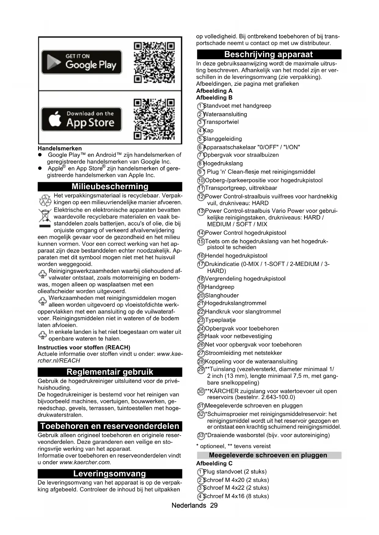 zijn handelsmerken of gere- gistreerde handelsmerken van Apple Inc. Milieubescherming Het verpakkingsmateriaal is recyclebaar. Verpak- kingen op een milieuvriendelijke manier afvoeren. Elektrische en elektronische apparaten bevatten waardevolle recyclebare materialen en vaak be- standdelen zoals batterijen, accu's of olie, die bij onjuiste omgang of verkeerd afvalverwijdering een mogelijk gevaar voor de gezondheid en het milieu kunnen vormen. Voor een correct werking van het ap- paraat zijn deze bestanddelen echter noodzakelijk. Ap- paraten met dit symbool mogen niet met het huisvuil worden weggegooid. Reinigingswerkzaamheden waarbij oliehoudend af- valwater ontstaat, zoals motorreiniging en bodem- was, mogen alleen op wasplaatsen met een olieafscheider worden uitgevoerd. Werkzaamheden met reinigingsmiddelen mogen alleen worden uitgevoerd op vloeistofdichte werk- oppervlakken met een aansluiting op de vuilwateraf- voer. Reinigingsmiddelen niet in wateren of de bodem laten afvloeien. In enkele landen is het niet toegestaan om water uit openbare wateren te halen. Instructies voor stoffen (REACH) Actuele informatie over stoffen vindt u onder: www.kae- rcher.nl/REACH Reglementair gebruik Gebruik de hogedrukreiniger uitsluitend voor de privé- huishouding. De hogedrukreiniger is bestemd voor het reinigen van bijvoorbeeld machines, voertuigen, bouwwerken, ge- reedschap, gevels, terrassen, tuintoestellen met hoge- drukwaterstralen. Toebehoren en reserveonderdelen Gebruik alleen origineel toebehoren en originele reser- veonderdelen. Deze garanderen een veilige en sto- ringsvrije werking van het apparaat. Informatie over toebehoren en reserveonderdelen vindt u onder www.kaercher.com. Leveringsomvang De leveringsomvang van het apparaat is op de verpak- king afgebeeld. Controleer de inhoud bij het uitpakken op volledigheid. Bij ontbrekend toebehoren of bij trans- portschade neemt u contact op met uw distributeur. Beschrijving apparaat In deze gebruiksaanwijzing wordt de maximale uitrus- ting beschreven. Afhankelijk van het model zijn er ver- schillen in de leveringsomvang (zie verpakking). Afbeeldingen, zie pagina met grafieken Afbeelding A Afbeelding B 1 Standvoet met handgreep 2 Wateraansluiting 3 Transportwiel 4 Kap 5 Slanggeleiding 6 Apparaatschakelaar "0/OFF" / "I/ON" 7 Opbergvak voor straalbuizen 8 Hogedrukslang 9 * Plug 'n' Clean-flesje met reinigingsmiddel 10 Opberg-/parkeerpositie voor hogedrukpistool 11 Transportgreep, uittrekbaar 12 Power Control-straalbuis vuilfrees voor hardnekkig vuil, drukniveau: HARD 13 Power Control-straalbuis Vario Power voor gebrui- kelijke reinigingstaken, drukniveaus: HARD /