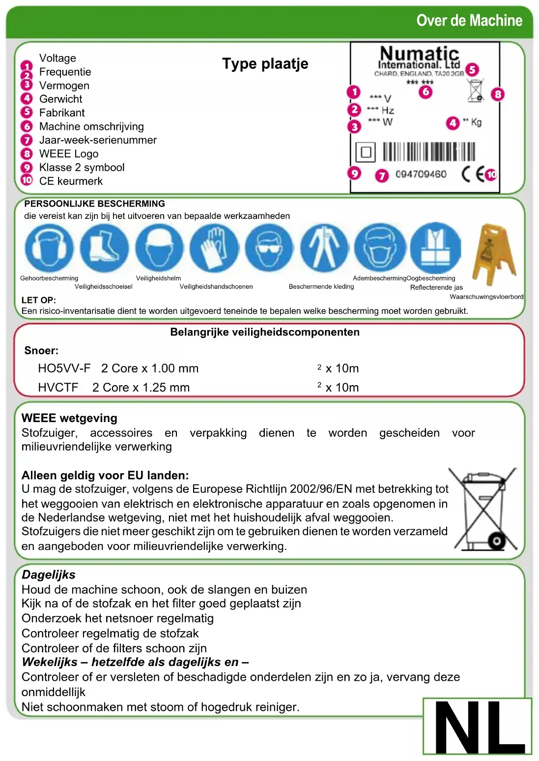 - Houd de diffusielter (indien van toepassing) schoon. Neem contact op met uw Numatic-verdeler als u het probleem niet kunt verhelpen of de machine dienst weigert. U kunt ook de technische hulplijn van Numatic bellen op +31 172 467 999Opsporen van defecten Onderhound stofzuiger Trek, indien de machine niet meer werkt, eerst de stekker uit het stopcontact alvorens te onder- zoeken wat de oorzaak is. Als de machine niet meer goed zuigt, schakel deze dan uit en trek de stekker uit het stopcontact, controleer vervolgens het mondstuk, de buizen en de slang op verstopping – als er hier geen sprake is van verstopping, kan de oorzaak een volle stofzak zijn of kan eventueel de lter verstopt zijn. Onderhound waterzuiger Trek, indien de machine niet meer werkt, eerst de stekker uit het stopcontact alvorens te onder- zoeken wat de oorzaak is. Als de machine verstopt is en niet meer zuigt, schakel deze dan uit en trek de stekker uit het stopcontact – als de vlotterklep is geactiveerd zal de zuiger ophouden te zuigen en het geluid veranderen. Verwijder de motoreenheid en laat de vloeistof uit de bak lopen; controleer, als de bak leeg is, of het mondstuk, de buizen en de slang niet verstopt zijn. Data