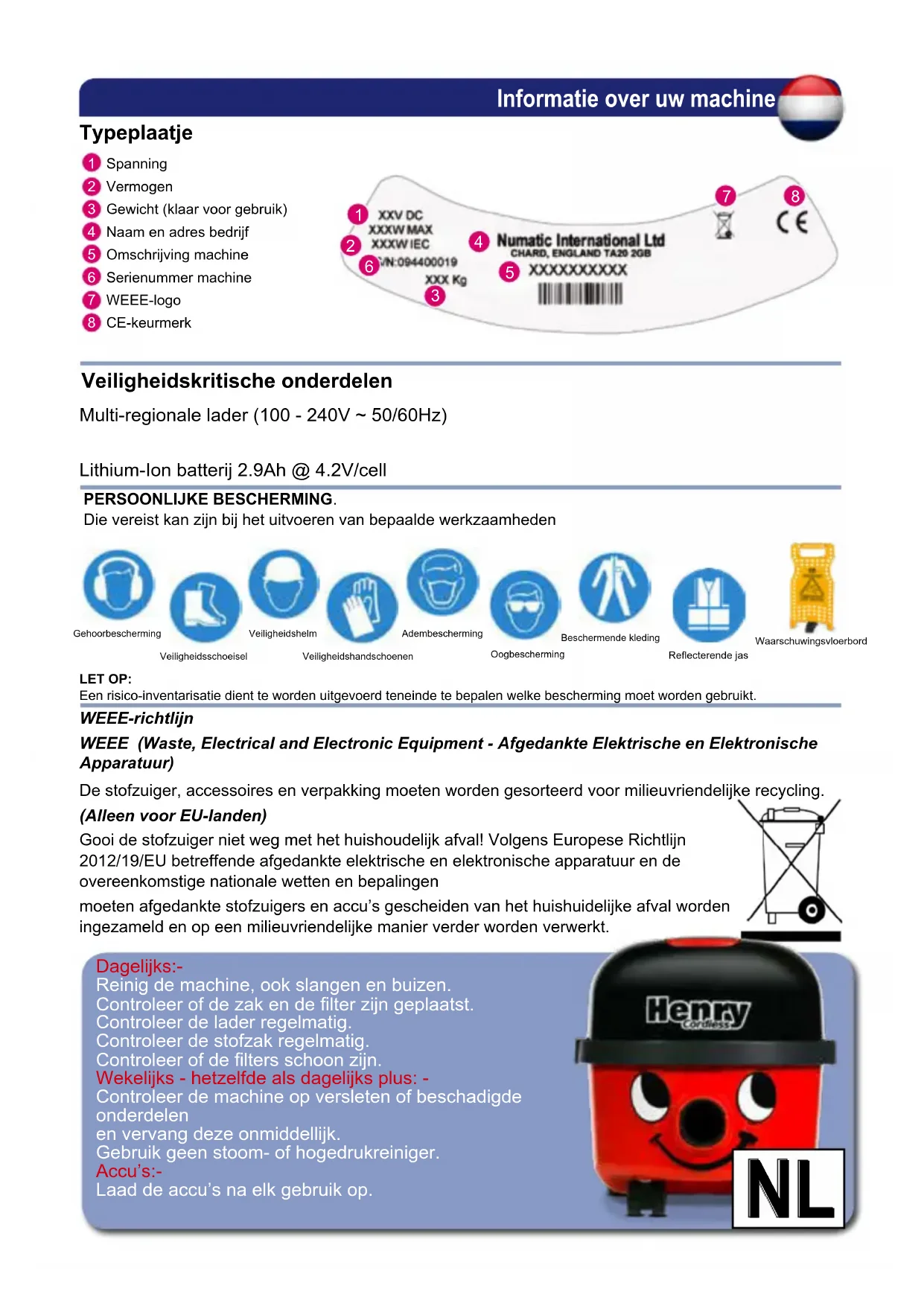 SpanningVermogenGewicht (klaar voor gebruik)Naam en adres bedrijfOmschrijving machineSerienummer machineWEEE-logoCE-keurmerk Typeplaatje Informatie over uw machine WEEE-richtlijn WEEE (Waste, Electrical and Electronic Equipment - Afgedankte Elektrische en Elektronische Apparatuur) De stofzuiger, accessoires en verpakking moeten worden gesorteerd voor milieuvriendelijke recycling. (Alleen voor EU-landen) Gooi de stofzuiger niet weg met het huishoudelijk afval! Volgens Europese Richtlijn 2012/19/EU betreffende afgedankte elektrische en elektronische apparatuur en de overeenkomstige nationale wetten en bepalingen moeten afgedankte stofzuigers en accu’s gescheiden van het huishuidelijke afval worden ingezameld en op een milieuvriendelijke manier verder worden verwerkt. Multi-regionale lader (100 - 240V ~ 50/60Hz) Lithium-Ion batterij 2.9Ah @ 4.2V/cell Veiligheidskritische onderdelen Reecterende jasGehoorbeschermingVeiligheidsschoeiselVeiligheidshelmVeiligheidshandschoenenAdembeschermingOogbeschermingBeschermende kleding PERSOONLIJKE BESCHERMING. Die vereist kan zijn bij het uitvoeren van bepaalde werkzaamheden LET OP: Een risico-inventarisatie dient te worden uitgevoerd teneinde te bepalen welke bescherming moet worden gebruikt.Waarschuwingsvloerbord Dagelijks:- Reinig de machine, ook slangen en buizen. Controleer of de zak en de lter zijn geplaatst. Controleer de lader regelmatig. Controleer de stofzak regelmatig. Controleer of de lters schoon zijn. Wekelijks - hetzelfde als dagelijks plus: - Controleer de machine op versleten of beschadigde onderdelen en vervang deze onmiddellijk. Gebruik geen stoom- of hogedrukreiniger. Accu’s:- Laad de accu’s na elk gebruik op.