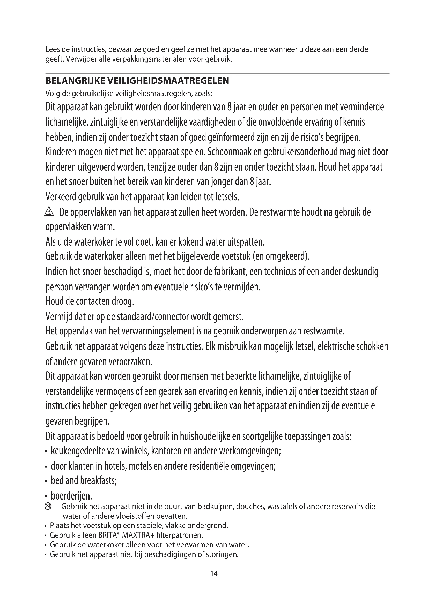 AE14 Lees de instructies, bewaar ze goed en geef ze met het apparaat mee wanneer u deze aan een derde geeft. Verwijder alle verpakkingsmaterialen voor gebruik. BELANGRIJKE VEILIGHEIDSMAATREGELEN Volg de gebruikelijke veiligheidsmaatregelen, zoals: Dit apparaat kan gebruikt worden door kinderen van 8 jaar en ouder en personen met verminderde lichamelijke, zintuiglijke en verstandelijke vaardigheden of die onvoldoende ervaring of kennis hebben, indien zij onder toezicht staan of goed geïnformeerd zijn en zij de risico’s begrijpen. Kinderen mogen niet met het apparaat spelen. Schoonmaak en gebruikersonderhoud mag niet door kinderen uitgevoerd worden, tenzij ze ouder dan 8 zijn en onder toezicht staan. Houd het apparaat en het snoer buiten het bereik van kinderen van jonger dan 8 jaar. Verkeerd gebruik van het apparaat kan leiden tot letsels. h De oppervlakken van het apparaat zullen heet worden. De restwarmte houdt na gebruik de oppervlakken warm. Als u de waterkoker te vol doet, kan er kokend water uitspatten. Gebruik de waterkoker alleen met het bijgeleverde voetstuk (en omgekeerd). Indien het snoer beschadigd is, moet het door de fabrikant, een technicus of een ander deskundig persoon vervangen worden om eventuele risico’s te vermijden. Houd de contacten droog. Vermijd dat er op de standaard/connector wordt gemorst. Het oppervlak van het verwarmingselement is na gebruik onderworpen aan restwarmte. Gebruik het apparaat volgens deze instructies. Elk misbruik kan mogelijk letsel, elektrische schokken of andere gevaren veroorzaken. Dit apparaat kan worden gebruikt door mensen met beperkte lichamelijke, zintuiglijke of verstandelijke vermogens of een gebrek aan ervaring en kennis, indien zij onder toezicht staan of instructies hebben gekregen over het veilig gebruiken van het apparaat en indien zij de eventuele gevaren begrijpen. Dit apparaat is bedoeld voor gebruik in huishoudelijke en soortgelijke toepassingen zoals: