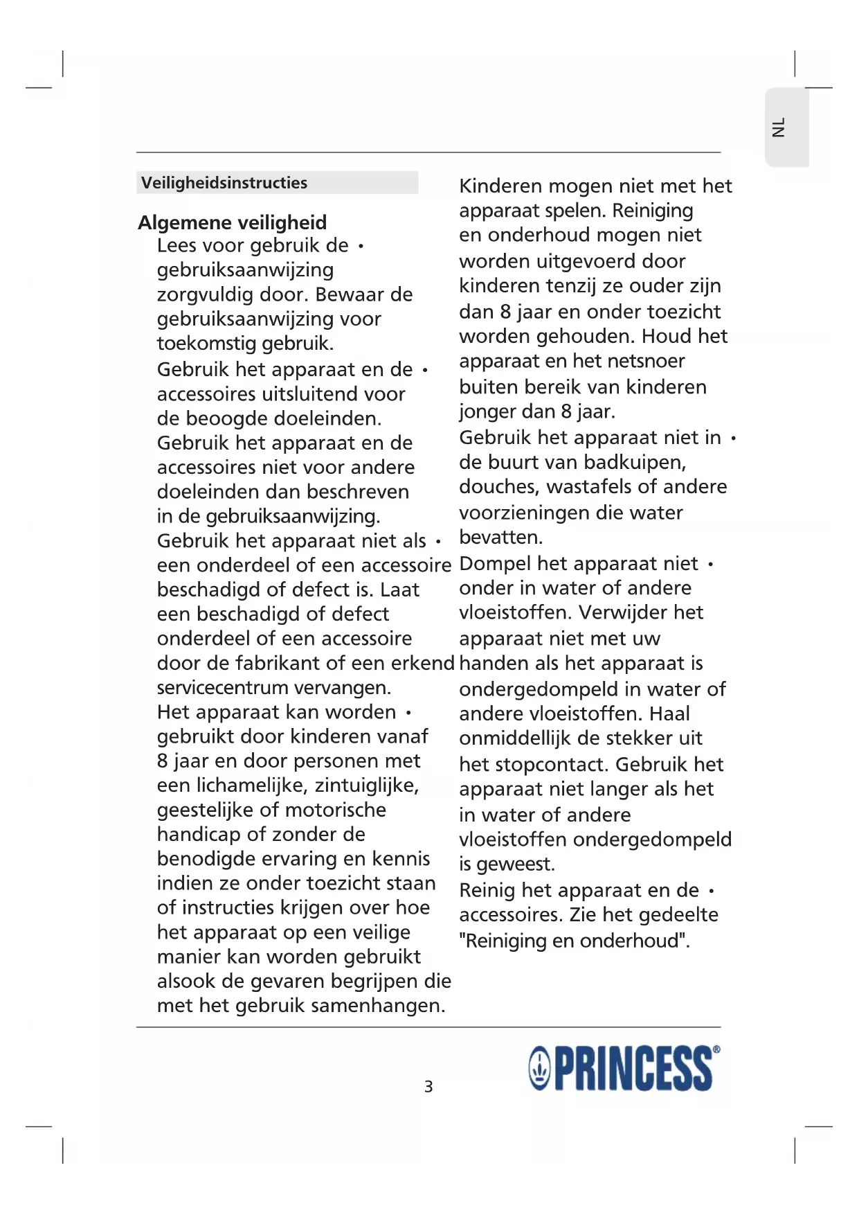 - Dompel het apparaat niet onder in water of andere vloeistoffen. Voorzichtig! - Reinig het apparaat niet met bijtende of schurende reinigingsmiddelen. - Gebruik geen scherpe voorwerpen om het apparaat te reinigen. - Reinig de accessoires niet in de vaatwasser. Reinig het apparaat en de verwarmings-• elementen met een zachte, vochtige doek. Droog het apparaat en de verwarmings- elementen grondig met een schone, droge doek. Reinig de verwarmingselementen met een • zachte, vochtige doek. Droog de verwarmingselementen grondig met een schone, droge doek. Reinig de binnenpan in sop. Spoel de • binnenpan af onder stromend water. Droog de binnenpan grondig. Reinig de rijstlepel en de maatbeker in sop. • Spoel de rijstlepel en de maatbeker af onder stromend water. Droog de rijstlepel en de maatbeker grondig. Beschrijving (fig. A) Uw 271940 Princess rijstkoker is ontworpen voor het koken van rijst. Het apparaat is uitsluitend geschikt voor gebruik binnenshuis. Het apparaat is alleen geschikt voor huishoudelijk gebruik.