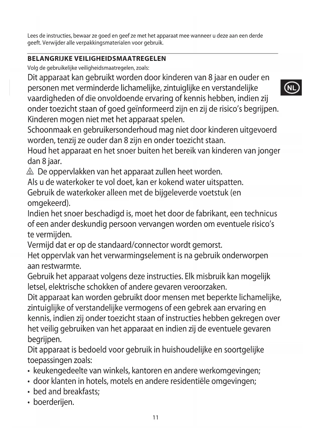 An d’éviter les problèmes occasionnés à l’environnement et à la santé par des substances dangereuses, les appareils et les batteries rechargeables et non rechargeables présentant l’un de ces symboles ne doivent pas être éliminés avec les déchets municipaux non triés. Éliminez dans tous les cas les produits électriques et électroniques et, le cas échéant, les batteries rechargeables et non rechargeables, dans un centre ociel et approprié de collecte/recyclage.11 Lees de instructies, bewaar ze goed en geef ze met het apparaat mee wanneer u deze aan een derde geeft. Verwijder alle verpakkingsmaterialen voor gebruik. BELANGRIJKE VEILIGHEIDSMAATREGELEN Volg de gebruikelijke veiligheidsmaatregelen, zoals: Dit apparaat kan gebruikt worden door kinderen van 8 jaar en ouder en personen met verminderde lichamelijke, zintuiglijke en verstandelijke vaardigheden of die onvoldoende ervaring of kennis hebben, indien zij onder toezicht staan of goed geïnformeerd zijn en zij de risico’s begrijpen. Kinderen mogen niet met het apparaat spelen. Schoonmaak en gebruikersonderhoud mag niet door kinderen uitgevoerd worden, tenzij ze ouder dan 8 zijn en onder toezicht staan. Houd het apparaat en het snoer buiten het bereik van kinderen van jonger dan 8 jaar. h De oppervlakken van het apparaat zullen heet worden. Als u de waterkoker te vol doet, kan er kokend water uitspatten. Gebruik de waterkoker alleen met de bijgeleverde voetstuk (en omgekeerd). Indien het snoer beschadigd is, moet het door de fabrikant, een technicus of een ander deskundig persoon vervangen worden om eventuele risico’s te vermijden. Vermijd dat er op de standaard/connector wordt gemorst. Het oppervlak van het verwarmingselement is na gebruik onderworpen aan restwarmte. Gebruik het apparaat volgens deze instructies. Elk misbruik kan mogelijk letsel, elektrische schokken of andere gevaren veroorzaken. Dit apparaat kan worden gebruikt door mensen met beperkte lichamelijke, zintuiglijke of verstandelijke vermogens of een gebrek aan ervaring en kennis, indien zij onder toezicht staan of instructies hebben gekregen over het veilig gebruiken van het apparaat en indien zij de eventuele gevaren begrijpen. Dit apparaat is bedoeld voor gebruik in huishoudelijke en soortgelijke toepassingen zoals: