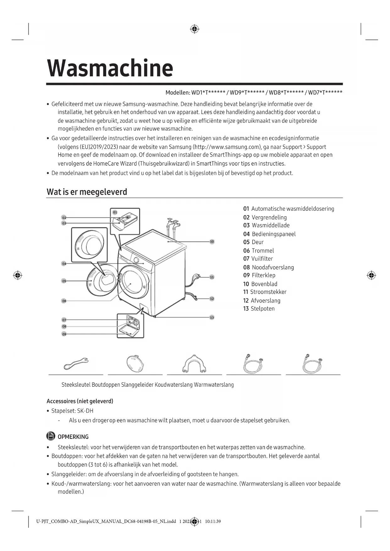 - Koud-/warmwaterslang: voor het aanvoeren van water naar de wasmachine. (Warmwaterslang is alleen voor bepaalde modellen.) U-PJT_COMBO-AD_SimpleUX_MANUAL_DC68-04198B-05_NL.indd 1 2022/7/11 10:11:39Nederlands2 Veiligheidsinformatie Veiligheidsinformatie Belangrijke veiligheidssymbolen De betekenis van de pictogrammen en symbolen in deze gebruikershandleiding: WAARSCHUWING Gevaar of onveilige handelingen die kunnen leiden tot ernstig persoonlijk letsel, de dood en/of schade aan eigendommen. LET OP Gevaar of onveilige handelingen die kunnen leiden tot lichamelijk letsel en/of materiële schade. OPMERKING Hiermee wordt aangegeven dat er risico op lichamelijk letsel of materiële schade bestaat. Lees de instructies Deze waarschuwingstekens dienen om lichamelijk letsel bij uzelf en bij anderen te voorkomen. Voer de aanwijzingen nauwgezet uit. Bewaar deze handleiding na het lezen op een veilige plek voor naslagdoeleinden. Lees alle instructies voordat u het apparaat in gebruik neemt. Zoals geldt voor alle elektrische apparatuur met bewegende delen bestaat er een mogelijk gebruiksrisico. Om dit apparaat veilig te kunnen gebruiken, dient u vertrouwd te raken met de bediening en voorzichtig te zijn bij het gebruik ervan. Belangrijke veiligheidsvoorschriften WAARSCHUWING Om de kans op brand, elektrische schokken of lichamelijk letsel bij het gebruik van het apparaat te verminderen, dient u deze algemene veiligheidsvoorschriften te volgen: