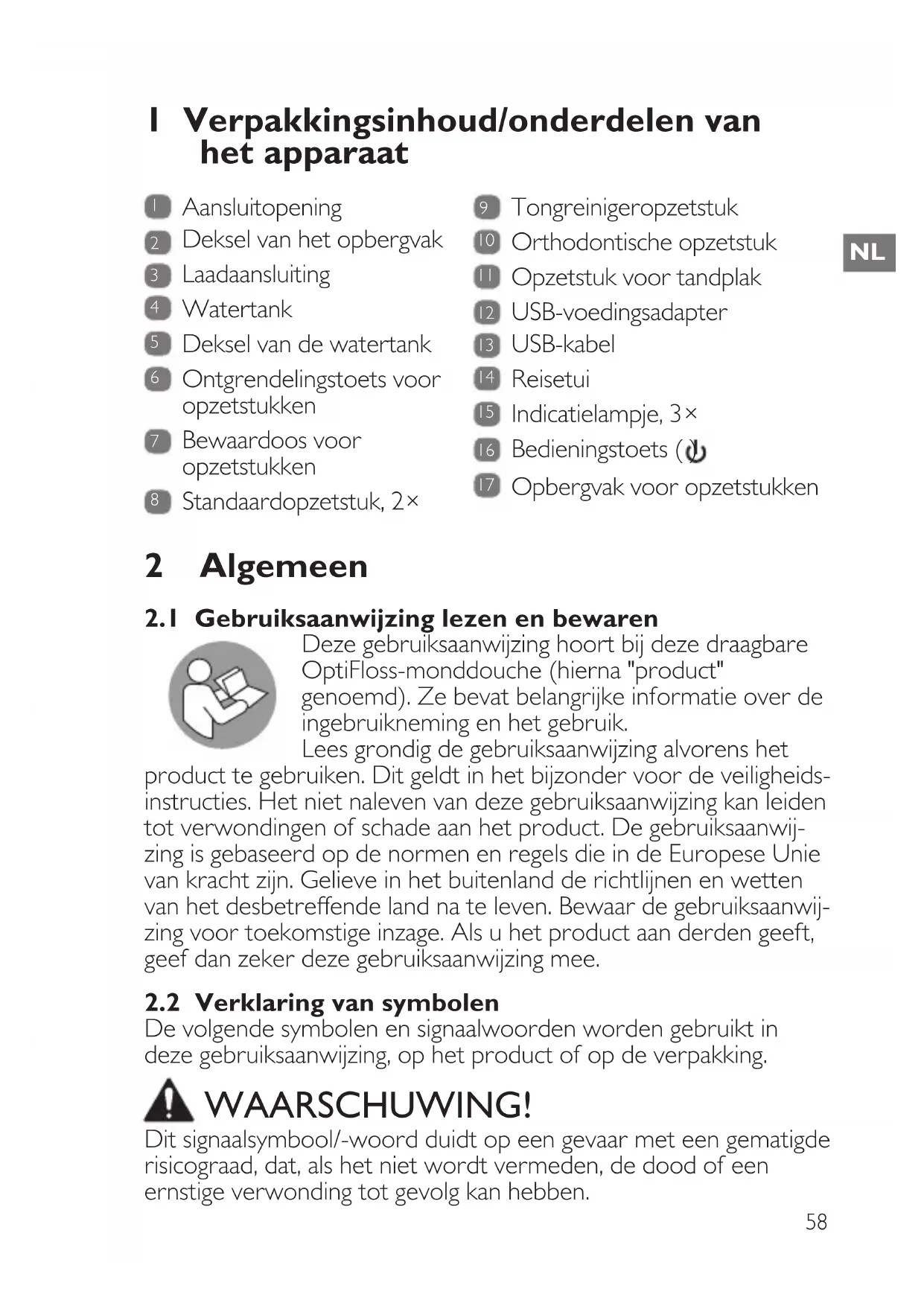 Inhoud 1 Verpakkingsinhoud/onderdelen van het apparaat ___________________________ 58 2 Algemeen _________________________________ 58