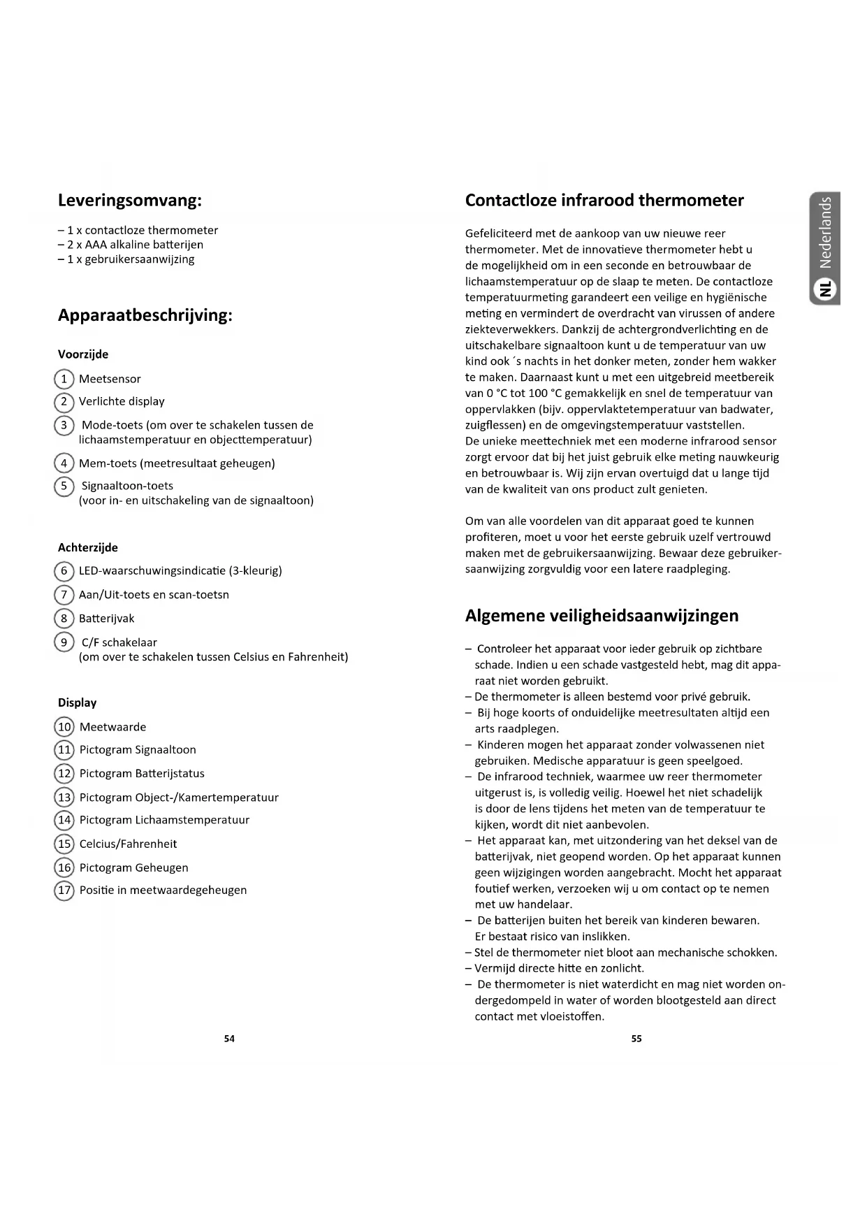 NL Nederlands Contactloze infrarood thermometer Gefeliciteerd met de aankoop van uw nieuwe reer thermometer. Met de innovaeve thermometer hebt u de mogelijkheid om in een seconde en betrouwbaar de lichaamstemperatuur op de slaap te meten. De contactloze temperatuurmeng garandeert een veilige en hygiënische meng en vermindert de overdracht van virussen of andere ziekteverwekkers. Dankzij de achtergrondverlichng en de uitschakelbare signaaltoon kunt u de temperatuur van uw kind ook ´s nachts in het donker meten, zonder hem wakker te maken. Daarnaast kunt u met een uitgebreid meetbereik van 0 °C tot 100 °C gemakkelijk en snel de temperatuur van oppervlakken (bijv. oppervlaktetemperatuur van badwater, zuigessen) en de omgevingstemperatuur vaststellen. De unieke meeechniek met een moderne infrarood sensor zorgt ervoor dat bij het juist gebruik elke meng nauwkeurig en betrouwbaar is. Wij zijn ervan overtuigd dat u lange jd van de kwaliteit van ons product zult genieten. Om van alle voordelen van dit apparaat goed te kunnen proteren, moet u voor het eerste gebruik uzelf vertrouwd maken met de gebruikersaanwijzing. Bewaar deze gebruiker- saanwijzing zorgvuldig voor een latere raadpleging. Algemene veiligheidsaanwijzingen – Controleer het apparaat voor ieder gebruik op zichtbare schade. Indien u een schade vastgesteld hebt, mag dit appa- raat niet worden gebruikt. – De thermometer is alleen bestemd voor privé gebruik. – Bij hoge koorts of onduidelijke meetresultaten aljd een arts raadplegen. – Kinderen mogen het apparaat zonder volwassenen niet gebruiken. Medische apparatuur is geen speelgoed. – De infrarood techniek, waarmee uw reer thermometer uitgerust is, is volledig veilig. Hoewel het niet schadelijk is door de lens jdens het meten van de temperatuur te kijken, wordt dit niet aanbevolen. – Het apparaat kan, met uitzondering van het deksel van de baerijvak, niet geopend worden. Op het apparaat kunnen geen wijzigingen worden aangebracht. Mocht het apparaat fouef werken, verzoeken wij u om contact op te nemen met uw handelaar. – De baerijen buiten het bereik van kinderen bewaren. Er bestaat risico van inslikken. – Stel de thermometer niet bloot aan mechanische schokken. – Vermijd directe hie en zonlicht. – De thermometer is niet waterdicht en mag niet worden on- dergedompeld in water of worden blootgesteld aan direct contact met vloeistoen.56 57 Wetenswaardigheden over de tempera- tuurmeng op de slaap De contactloze thermometer meet de door de huid uitge- straalde infrarood energie van de slapen. Hierbij wordt de waarde van de uitgestraalde energie op de slapen gemeten en met de omgevingstemperatuur in een lichaamstempera- tuurwaarde omgezet. Het meetresultaat wordt binnen een seconde weergegeven. Van koorts spreekt men als de lichaamstemperatuur boven de 38 graden Celsius sjgt. De koorts is een teken dat ons lichaam zich verweert tegen ziekteverwekkers. Vergeli- jk nooit temperaturen met elkaar die op verschillende lichaamsdelen zijn gemeten, omdat ook bij gezonde personen de temperaturen op verschillende lichaamsdelen kunnen afwijken. De gemeten lichaamstemperaturen kunnen ook variëren aankelijk van het moment van de dag en de leeijd van de persoon. In principe wordt tussen de lichaamstemperatuur en de oppervlaktetemperatuur gekozen. De gemeten lichaamstemperatuur (rectaal gemeten) kan in vergelijking met de oppervlaktetemperatuur (op de slapen gemeten), aankelijk van het koortsverloop, hoger liggen. In de fase van het sjgen van koorts conserveert het lichaam de warmte binnenin. Dit leidt tot een jdelijke aoeling van de huid bij reeds bestaande koorts. In dit geval kan de met een contactloze thermometer gemeten oppervlaktetemperatu- ur buitengewoon laag zijn. Hier wordt een controlemeng aanbevolen met een gebruikelijke koortsthermometer die geschikt is voor de rectale meng. Een meng van de binnenste lichaamstemperatuur met een rectale koortsthermometer wordt aanbevolen: – als het meetresultaat verrassend laag is – bij pasgeborenen gedurende de eerste 100 dagen – bij kinderen onder 3 jaar die een kwetsbaar immuunsys- teem hebben of die bij het optreden of niet-optreden van koorts verontrustend reageren. Als u niet zeker weet hoe u de resultaten moet interpreteren of als er abnormale waarden voorkomen (bijv. koorts), kunt u zich het beste tot uw huisarts wenden. Ingebruikname Bij eerst gebruik moeten de baerijen geplaatst worden in de thermometer. Let daarbij er op dat u de baerijen met de juiste polariteit (+/-) plaatst. Het meten van lichaamstemperatuur De thermometer is zo ontworpen dat hij de lichaamstempera- tuur boven de wenkbrauwen, tussen het voorhoofd en de sla- pen, meet. Als u de temperatuur op een andere lichaamsplek meet, kunnen onnauwkeurige meetgegevens ontstaan. – Verzeker u voor elke meng dat de sensor niet vervuild is. Als dit het geval is, reinig de sensor overeenkomsg de instruces op pagina 60. – Controleer of het voorhoofd vochg is (Cool Skin Eekt). Dit moet absoluut droog zijn. – De slapen moeten vrij zijn van vuil en cosmeca. Vermijd de meng op eventueel bestaande liekens. – Bloedvaatvernauwende medicijnen kunnen het meetresul- taat beïnvloeden. – Draagbare en mobiele communicae-installaes kunnen de thermometer beïnvloeden. – Wacht met de meng ten minste 30 minuten na een spore- ve acviteit, na het baden of na het eten. – Gebruik de thermometer indien mogelijk niet in de bui- tenlucht, maar alleen binnenshuis. De externe invloeden zoals wind en buitentemperatuur kunnen het meetresultaat beïnvloeden. – Als het apparaat uit een omgeving met externe buitentem- peratuur naar binnen gebracht wordt, houd het minstens een uur op kamertemperatuur voordat u een meng uitvoert. – Wanneer de thermometer voor de meng te lang wordt vastgehouden, wordt het apparaat verwarmd. Dit kan tot onjuiste meetresultaten leiden. Lege baerijen horen niet thuis in de afvalbak. De meegeleverde baerijen mogen niet worden opgeladen of met andere hulp