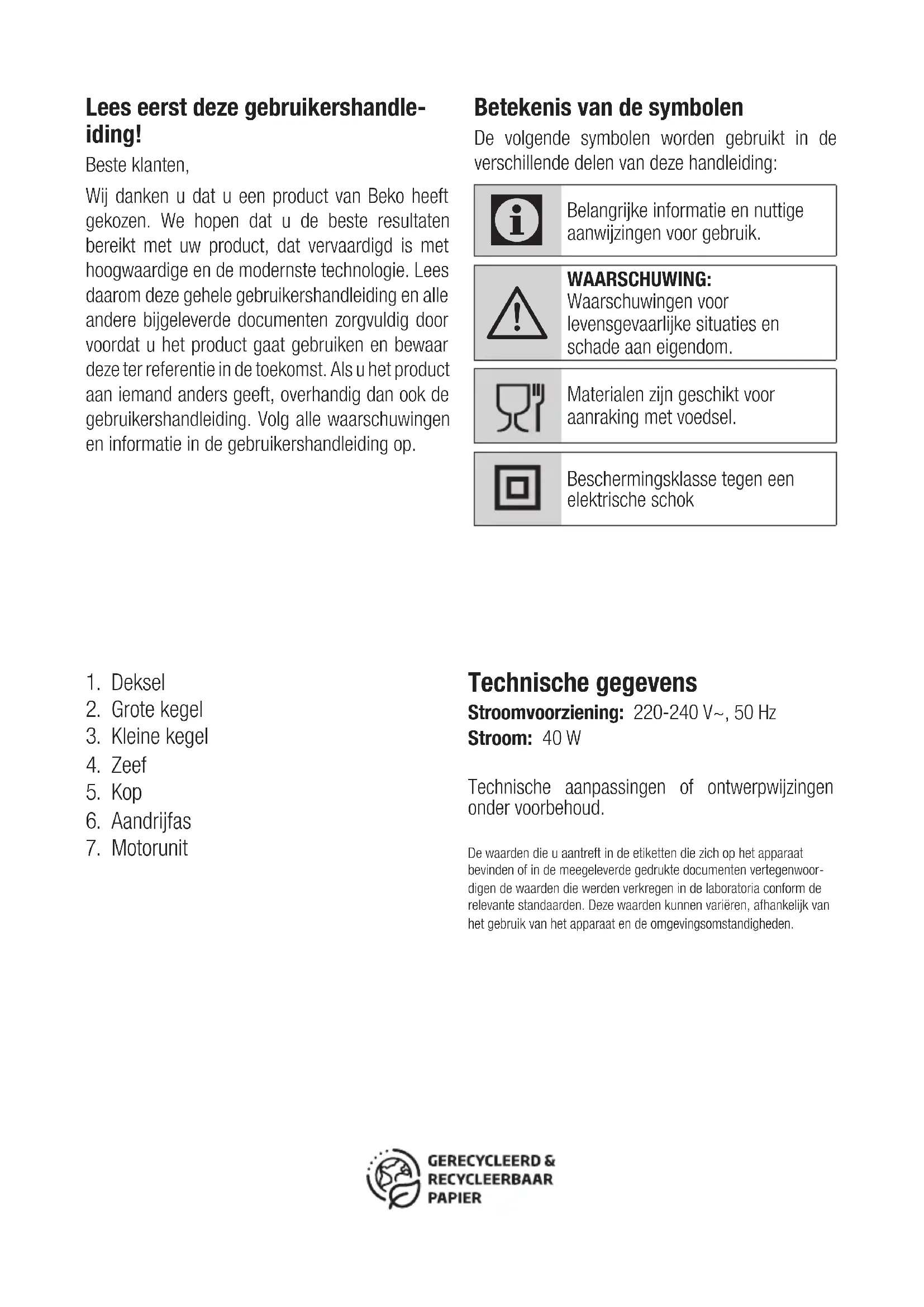 Prima di contattare l’assistenza tecnica, al fine di agevolare la gestione della chiamata, è necessario avere a portata di mano il modello del prodotto e il documento fiscale di acquisto.Lees eerst deze gebruikershandle- iding! Beste klanten,Wij danken u dat u een product van Beko heeft gekozen. We hopen dat u de beste resultaten bereikt met uw product, dat vervaardigd is met hoogwaardige en de modernste technologie. Lees daarom deze gehele gebruikershandleiding en alle andere bijgeleverde documenten zorgvuldig door voordat u het product gaat gebruiken en bewaar deze ter referentie in de toekomst. Als u het product aan iemand anders geeft, overhandig dan ook de gebruikershandleiding. Volg alle waarschuwingen en informatie in de gebruikershandleiding op. Betekenis van de symbolen De volgende symbolen worden gebruikt in de verschillende delen van deze handleiding: Belangrijke informatie en nuttige aanwijzingen voor gebruik. WAARSCHUWING: Waarschuwingen voor levensgevaarlijke situaties en schade aan eigendom.Materialen zijn geschikt voor aanraking met voedsel.Beschermingsklasse tegen een elektrische schok
