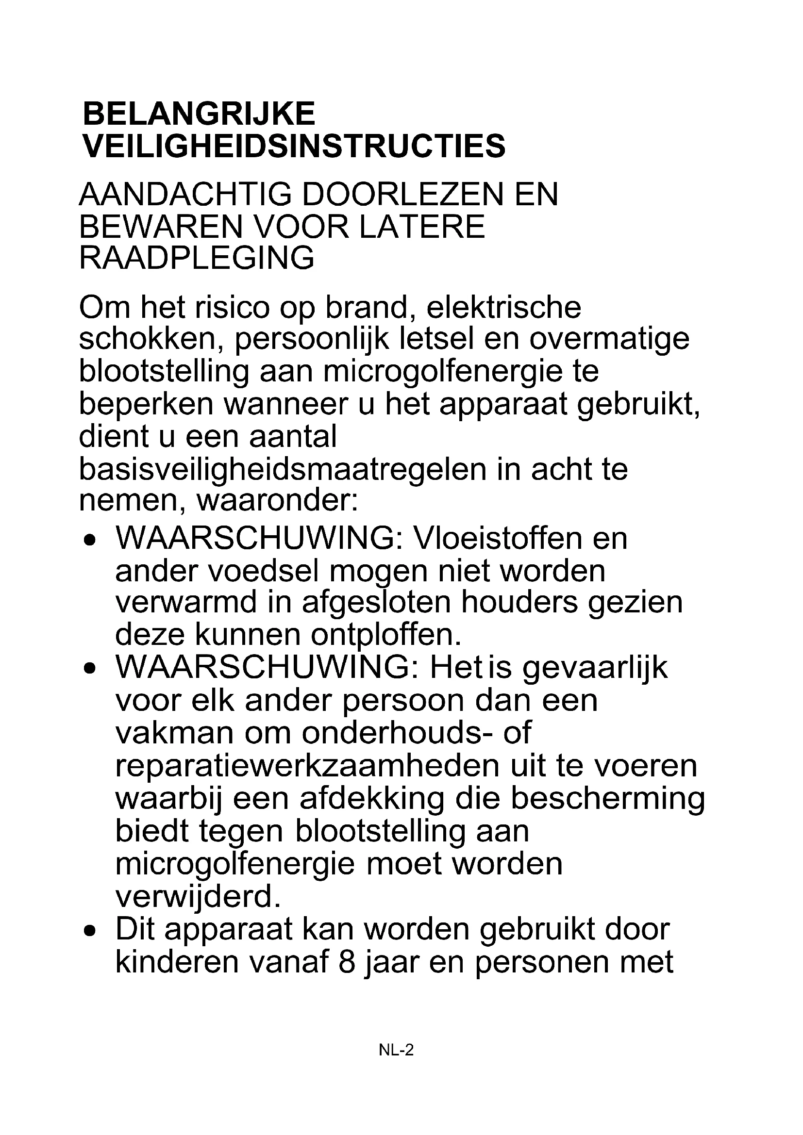- WAARSCHUWING: Vloeistoffen en ander voedsel mogen niet worden verwarmd in afgesloten houders gezien deze kunnen ontploffen.
