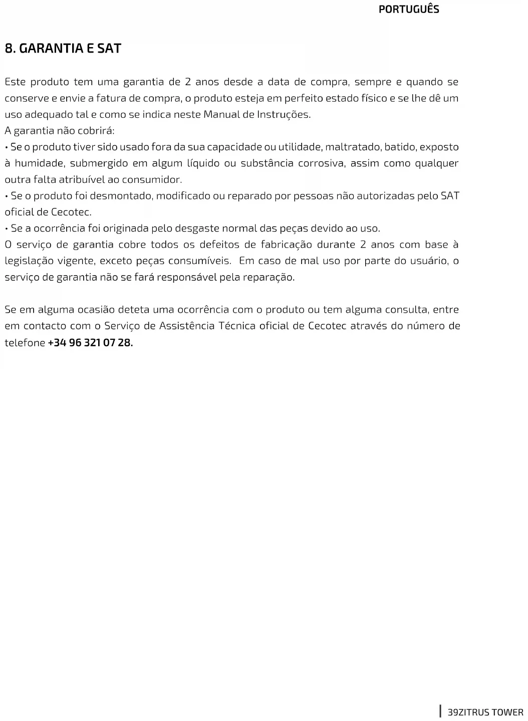 - Als het incident veroorzaakt is door de normale slijtage van de onderdelen als gevolg van gebruik. De garantieservice dekt alle fabricagefouten gedurende 2 jaar op basis van de huidige wetgeving, met uitzondering op gebruikte onderdelen. In het geval van verkeerd gebruik door de gebruiker zal de garantieservice niet verantwoordelijk zijn voor de reparatie. Als u in elk geval een incident met het product detecteert of als u een vraag heeft, neem dan contact op met de officiële Technische Ondersteuningsservice van Cecotec via het telefoonnummer +34 96 321 07 28.46 ZITRUS TOWERADJUST EASY BLACK INOX/WHITE POLSKI