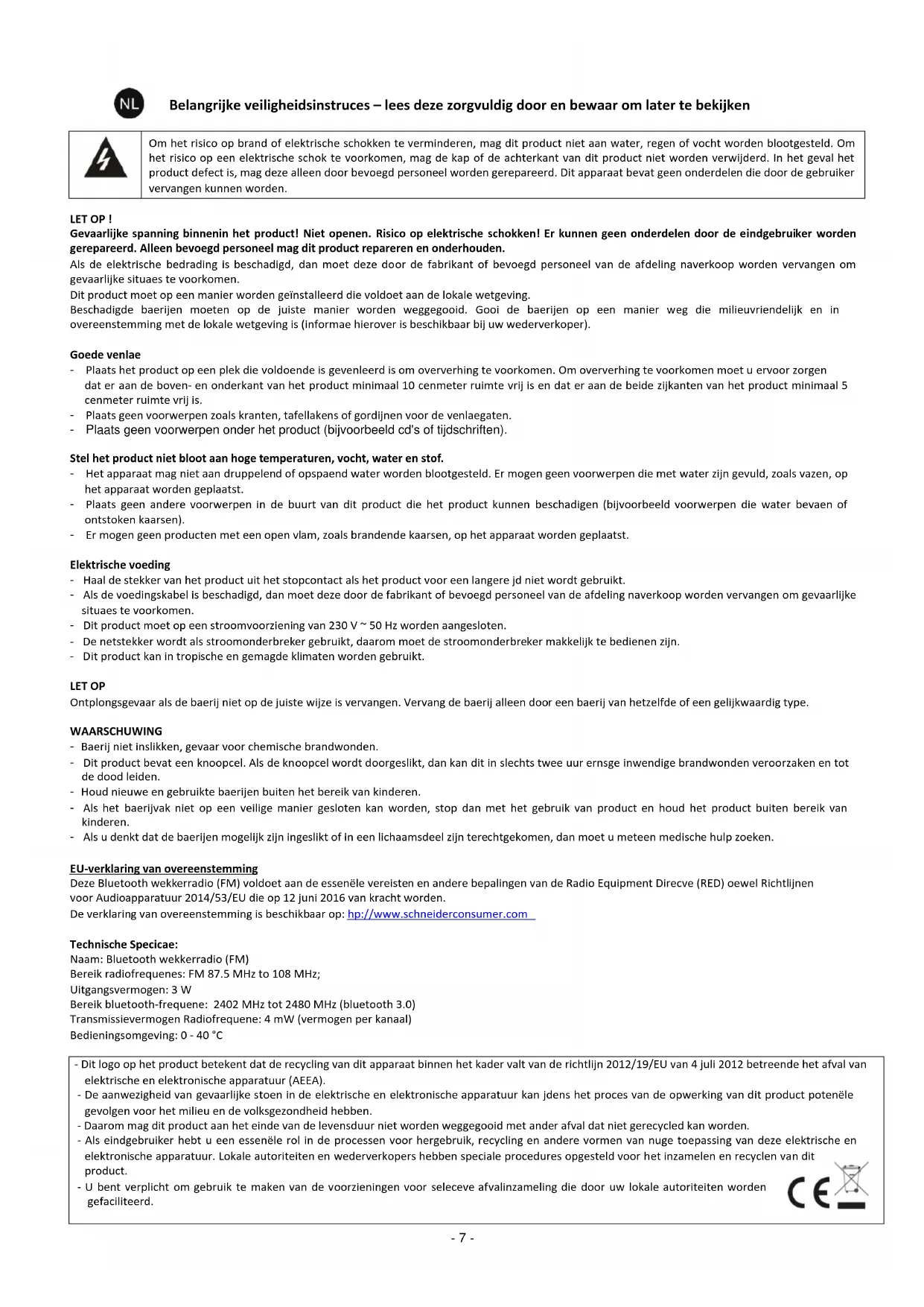 LET OP ! Gevaarlijke spanning binnenin het product! Niet openen. Risico op elektrische schokken! Er kunnen geen onderdelen door de eindgebruiker worden gerepareerd. Alleen bevoegd personeel mag dit product repareren en onderhouden. Als de elektrische bedrading is beschadigd, dan moet deze door de fabrikant of bevoegd personeel van de afdeling naverkoop worden vervangen om gevaarlijke situaties te voorkomen. Dit product moet op een manier worden geïnstalleerd die voldoet aan de lokale wetgeving. Beschadigde batterijen moeten op de juiste manier worden weggegooid. Gooi de batterijen op een manier weg die milieuvriendelijk en in overeenstemming met de lokale wetgeving is (informatie hierover is beschikbaar bij uw wederverkoper). Goede ventilatie - Plaats het product op een plek die voldoende is geventileerd is om oververhitting te voorkomen. Om oververhitting te voorkomen moet u ervoor zorgen dat er aan de boven- en onderkant van het product minimaal 10 centimeter ruimte vrij is en dat er aan de beide zijkanten van het product minimaal 5 centimeter ruimte vrij is. - Plaats geen voorwerpen zoals kranten, tafellakens of gordijnen voor de ventilatiegaten. - Plaats geen voorwerpen onder het product (bijvoorbeeld cd's of tijdschriften). Stel het product niet bloot aan hoge temperaturen, vocht, water en stof. - Het apparaat mag niet aan druppelend of opspattend water worden blootgesteld. Er mogen geen voorwerpen die met water zijn gevuld, zoals vazen, op het apparaat worden geplaatst. - Plaats geen andere voorwerpen in de buurt van dit product die het product kunnen beschadigen (bijvoorbeeld voorwerpen die water bevatten of ontstoken kaarsen). - Er mogen geen producten met een open vlam, zoals brandende kaarsen, op het apparaat worden geplaatst. Elektrische voeding - Haal de stekker van het product uit het stopcontact als het product voor een langere tijd niet wordt gebruikt. - Als de voedingskabel is beschadigd, dan moet deze door de fabrikant of bevoegd personeel van de afdeling naverkoop worden vervangen om gevaarlijke situaties te voorkomen. - Dit product moet op een stroomvoorziening van 230 V ~ 50 Hz worden aangesloten. - De netstekker wordt als stroomonderbreker gebruikt, daarom moet de stroomonderbreker makkelijk te bedienen zijn. - Dit product kan in tropische en gematigde klimaten worden gebruikt. LET OP Ontploffingsgevaar als de batterij niet op de juiste wijze is vervangen. Vervang de batterij alleen door een batterij van hetzelfde of een gelijkwaardig type. WAARSCHUWING - Batterij niet inslikken, gevaar voor chemische brandwonden. - Dit product bevat een knoopcel. Als de knoopcel wordt doorgeslikt, dan kan dit in slechts twee uur ernstige inwendige brandwonden veroorzaken en tot de dood leiden. - Houd nieuwe en gebruikte batterijen buiten het bereik van kinderen. - Als het batterijvak niet op een veilige manier gesloten kan worden, stop dan met het gebruik van product en houd het product buiten bereik van kinderen. - Als u denkt dat de batterijen mogelijk zijn ingeslikt of in een lichaamsdeel zijn terechtgekomen, dan moet u meteen medische hulp zoeken. EU-verklaring van overeenstemming Deze Bluetooth wekkerradio (FM) voldoet aan de essentiële vereisten en andere bepalingen van de Radio Equipment Directive (RED) oftewel Richtlijnen voor Audioapparatuur 2014/53/EU die op 12 juni 2016 van kracht worden. De verklaring van overeenstemming is beschikbaar op: http://www.schneiderconsumer.com Technische Specificatie: Naam: Bluetooth wekkerradio (FM) Bereik radiofrequenties: FM 87.5 MHz to 108 MHz; Uitgangsvermogen: 3 W Bereik bluetooth-frequentie: 2402 MHz tot 2480 MHz (bluetooth 3.0) Transmissievermogen Radiofrequentie: 4 mW (vermogen per kanaal) Bedieningsomgeving: 0 - 40 °C - Dit logo op het product betekent dat de recycling van dit apparaat binnen het kader valt van de richtlijn 2012/19/EU van 4 juli 2012 betreffende het afval van elektrische en elektronische apparatuur (AEEA). - De aanwezigheid van gevaarlijke stoffen in de elektrische en elektronische apparatuur kan tijdens het proces van de opwerking van dit product potentiële gevolgen voor het milieu en de volksgezondheid hebben. - Daarom mag dit product aan het einde van de levensduur niet worden weggegooid met ander afval dat niet gerecycled kan worden. - Als eindgebruiker hebt u een essentiële rol in de processen voor hergebruik, recycling en andere vormen van nuttige toepassing van deze elektrische en elektronische apparatuur. Lokale autoriteiten en wederverkopers hebben speciale procedures opgesteld voor het inzamelen en recyclen van dit product. - U bent verplicht om gebruik te maken van de voorzieningen voor selectieve afvalinzameling die door uw lokale autoriteiten worden gefaciliteerd.- 8 -