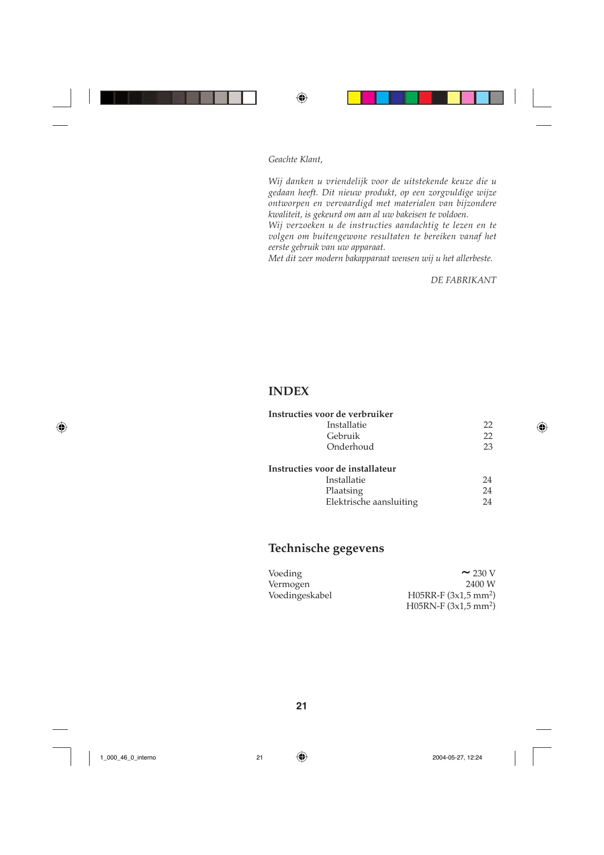 2004-05-27, 12:24 Geachte Klant, Wij danken u vriendelijk voor de uitstekende keuze die u gedaan heeft. Dit nieuw produkt, op een zorgvuldige wijze ontworpen en vervaardigd met materialen van bijzondere kwaliteit, is gekeurd om aan al uw bakeisen te voldoen. Wij verzoeken u de instructies aandachtig te lezen en te volgen om buitengewone resultaten te bereiken vanaf het eerste gebruik van uw apparaat. Met dit zeer modern bakapparaat wensen wij u het allerbeste. DE FABRIKANT INDEX Instructies voor de verbruiker Installatie Gebruik Onderhoud