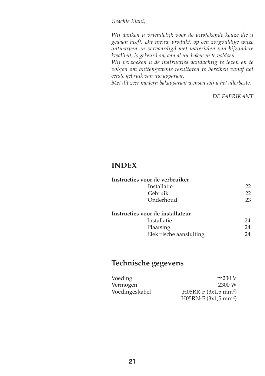 Geachte Klant, Wij danken u vriendelijk voor de uitstekende keuze die u gedaan heeft. Dit nieuw produkt, op een zorgvuldige wijze ontworpen en vervaardigd met materialen van bijzondere kwaliteit, is gekeurd om aan al uw bakeisen te voldoen. Wij verzoeken u de instructies aandachtig te lezen en te volgen om buitengewone resultaten te bereiken vanaf het eerste gebruik van uw apparaat. Met dit zeer modern bakapparaat wensen wij u het allerbeste. DE FABRIKANT INDEX Instructies voor de verbruiker Installatie Gebruik Onderhoud