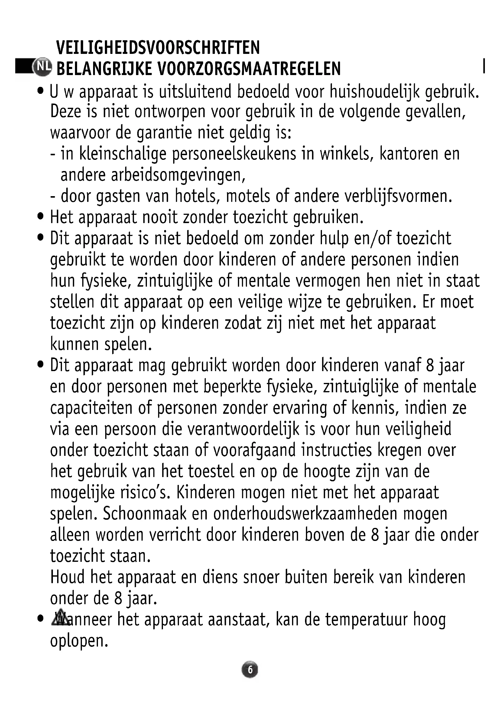- Dit apparaat mag gebruikt worden door kinderen vanaf 8 jaar en door personen met beperkte fysieke, zintuiglijke of mentale capaciteiten of personen zonder ervaring of kennis, indien ze via een persoon die verantwoordelijk is voor hun veiligheid onder toezicht staan of voorafgaand instructies kregen over het gebruik van het toestel en op de hoogte zijn van de mogelijke risico’s. Kinderen mogen niet met het apparaat spelen. Schoonmaak en onderhoudswerkzaamheden mogen alleen worden verricht door kinderen boven de 8 jaar die onder toezicht staan. Houd het apparaat en diens snoer buiten bereik van kinderen onder de 8 jaar.