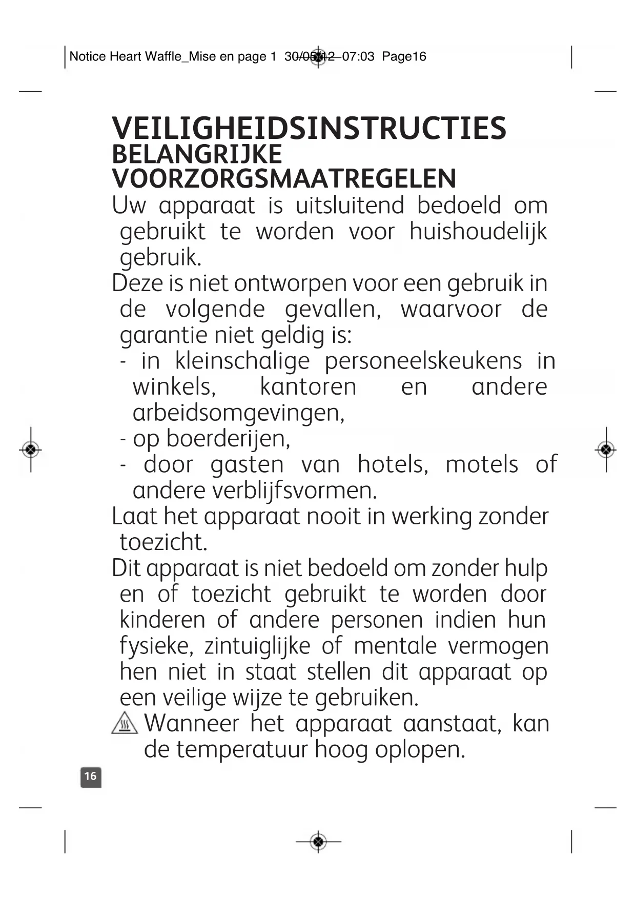 Your appliance contains valuable materials which can be recovered or recycled. ‹ Leave it at a local civic waste collection point. Notice Heart Waffle_Mise en page 1 30/05/12 07:03 Page1516 VEILIGHEIDSINSTRUCTIES BELANGRIJKE VOORZORGSMAATREGELEN Uw apparaat is uitsluitend bedoeld om gebruikt te worden voor huishoudelijk gebruik. Deze is niet ontworpen voor een gebruik in de volgende gevallen, waarvoor de garantie niet geldig is: - in kleinschalige personeelskeukens in winkels, kantoren en andere arbeidsomgevingen, - op boerderijen, - door gasten van hotels, motels of andere verblijfsvormen. Laat het apparaat nooit in werking zonder toezicht. Dit apparaat is niet bedoeld om zonder hulp en of toezicht gebruikt te worden door kinderen of andere personen indien hun fysieke, zintuiglijke of mentale vermogen hen niet in staat stellen dit apparaat op een veilige wijze te gebruiken. Wanneer het apparaat aanstaat, kan de temperatuur hoog oplopen. Notice Heart Waffle_Mise en page 1 30/05/12 07:03 Page1617